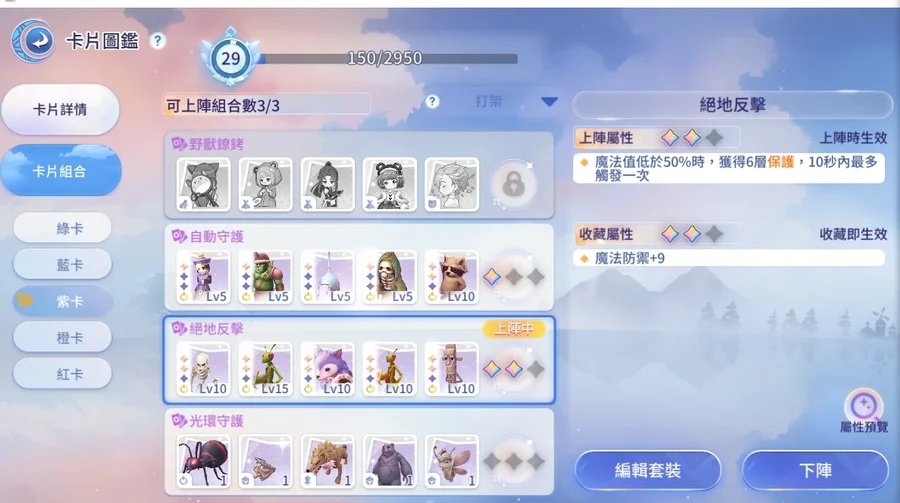 紫卡套:特異屏障-滿星魔力溢出-滿星靈魂燃燒-2星(部分卡在收藏)自動守護-1星絕地反擊-2星光環守護-開啟未升