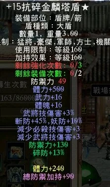 大盾:17黑星聚精盾(三洞嵌武傷9%,0/1次)、15黑星金麟塔盾(碎13%,0/2次)