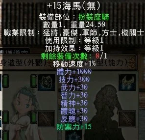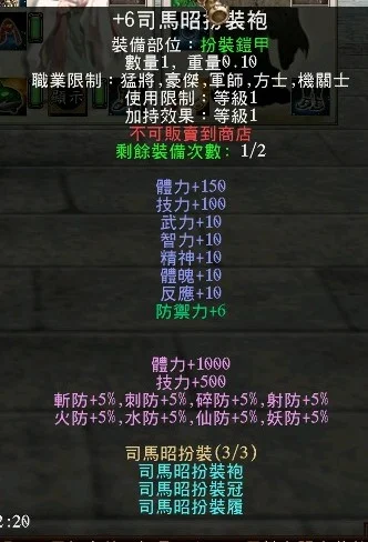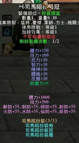 扮裝:遠古戰衣99等、司馬昭扮裝套、雷霆劍輪、15海馬(體1000各能力30)、扮裝武器破雲龍槍(pvp2%)