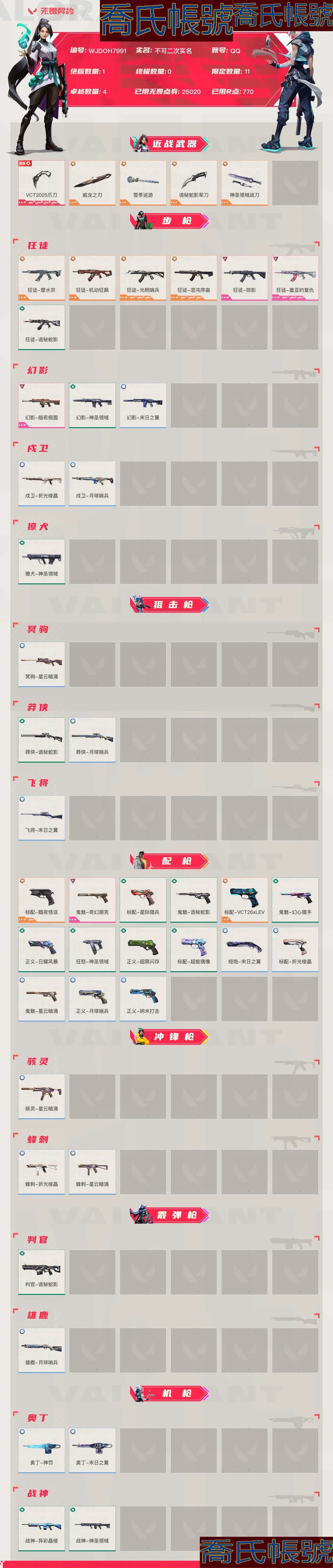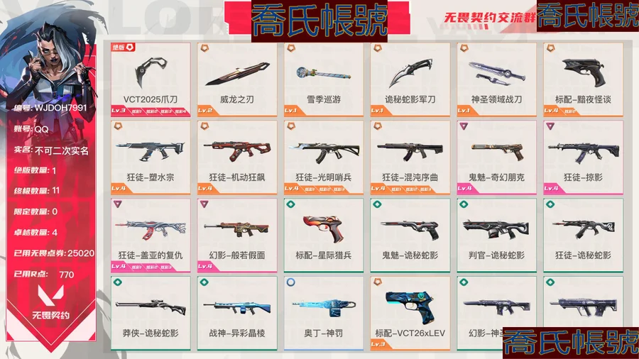 【OBWJDOH799142】Lv197 白銀I, 刀皮數量5,槍皮數量41(絕版1限定11終極0卓越4);皮膚資產價值25020,已用R點770;【刀皮】:近戰武器-VCT2025爪刀,近戰武器-威龍之刃,近戰武器-雪季巡遊,近戰武器-詭秘蛇影軍刀,近戰武器-神聖領域戰刀; 【槍皮】:標配-黯夜怪談,狂徒-塑水宗,狂徒-機動狂飆,狂徒-光明哨兵,狂徒-混沌序曲,鬼魅-奇幻朋克,狂徒-掠影,狂徒-蓋亞的復仇,幻影-般若假面,標配-星際獵兵,鬼魅-詭秘蛇影,判官-詭秘蛇影,狂徒-詭秘蛇影,莽俠-詭秘蛇影,戰神-異彩晶稜,奧丁-神罰,標配-VCT26xLEV,幻影-神聖領域,獠犬-神聖領域,正義-日耀風暴,正義-超限快閃記憶體,鬼魅-幻心獵手,標配-超能偶像,狂怒-神聖領域,戰神-神聖領域,幻影-末日之翼,戍衛-折光稜晶,戍衛-月球哨兵,冥駒-星雲暗湧,莽俠-月球哨兵,飛將-末日之翼,正義-月球哨兵,正義-奈米打擊,鬼魅-星雲暗湧,標配-折光稜晶,短炮-末日之翼,駭靈-星雲暗湧,蜂刺-折光稜晶,蜂刺-星雲暗湧,雄鹿-月球哨兵,奧丁-末日之翼;【熱門卡面】:5週年消滅源能者卡面,小怪獸卡面,盡情舞動卡面,V25巴黎序曲卡面,終章戰術偶像團卡面,三重威脅卡面,5週年為何而戰卡面,禁滅工牌卡面,終章TB-01戰術巨熊卡面,觸不可及卡面,5週年掌控全域性卡面,再火一回卡面,身陷蝰腹卡面,大軍“鴨”境卡面,夜露vs不死鳥卡面,5週年薪火初燃卡面,是不是哥們卡面,5週年卡面,親手縫製卡面,狂歡就現在卡面,孤獨派對卡面,勢不可擋捷風卡面,蓋可工牌卡面,設計草圖卡面,瑟瑟發抖卡面,喝杯奶茶解解壓卡面,許願星砂卡面,末日之翼卡面,詭秘蛇影卡面,吃飯的本事卡面,完好陳列卡面,噬影者卡面,脫脂牛奶卡面,嚼嚼小零食卡面,兔截棍卡面,貴賓限行設計圖卡面,幻稜工牌卡面,多邊狐卡面,稜彩通道卡面,勢不可擋星礈卡面,擲骰子決定先攻吧卡面,VCT2025CN聯賽卡面,VCT2025太平洋聯賽卡面,VCT2025美洲聯賽卡面,VCT2025EMEA聯賽卡面,芮娜vs蝰蛇卡面,別冒尖卡面,月球哨兵卡面,仿生摺疊學習卡面,天台狂歡卡面,神聖領域卡面,靈蛇賀春卡面,星雲暗湧卡面,晚五朝九卡面,宇宙大戰卡面,還是老一套卡面,鈦狐工牌卡面,朝九晚五卡面,莽俠設計圖卡面,奈米炸彈卡面,光輝雙人組卡面,手柄給我卡面,午後燒烤卡面,無畏契約吉祥物卡面,進入射程卡面,完美調諧卡面,雙城之戰姐妹卡面,雙城之戰金克絲卡面,雙城之戰擁抱卡面,歡迎來到底城卡面,球鞋控卡面,精靈大戰卡面,黑夢工牌卡面,南瓜盛典卡面,VCTCN首冠卡面,防止拆彈卡面,戰術打碟卡面,寧靜海岸卡面,熱舞環節卡面,捷風vs捷風卡面,天籟之鋼卡面,修車達人卡面,古典雕塑卡面,正義的化身卡面,終章生意人麥寶卡面,鐵之華卡面,時間到卡面,最高舞臺卡面,月光靈狐卡面,聲感陷阱設計圖卡面,樹懶大作戰卡面,霓幀牛蛙卡面,夢幻奶茶卡面,咖啡因之夢卡面,源能反應卡面,水手煎餅卡面,匠心瓷繪卡面,戰繩燃脂卡面,零點嗅探設計圖卡面,沙雕爆能器卡面,代號紅色卡面,清除名單卡面,新兵報到卡面,V契約卡面,無畏契約卡面;【熱門掛飾】:VCTxLEV掛飾,電擊搖滾掛飾,V25第六幕紀念幣掛飾,淡定鴨掛飾,致命劑量掛飾,V25第五幕紀念幣掛飾,海豹的認可掛飾,雙城之戰魄羅掛飾,薰衣草之心掛飾,動力機箱掛飾,瑞思拜掛飾,V25第四幕紀念幣掛飾,5週年掛飾,捏捏球掛飾,內測金鑰掛飾,歡樂餃子掛飾,V25第三幕紀念幣掛飾,神中神掛飾,奪命毒蠍掛飾,樹懶戰術掛飾,末日之翼掛飾,詭秘蛇影掛飾,誘捕陷阱掛飾,袖珍炮塔掛飾,電光跑鞋掛飾,達摩娃娃掛飾,好運之舞掛飾,鮮蝦手握掛飾,V25第二幕紀念幣掛飾,折光稜晶掛飾,空中接力掛飾,太空熊熊掛飾,小小行星掛飾,VCT2025CN聯賽掛飾,VCT2025太平洋聯賽掛飾,VCT2025EMEA聯賽掛飾,VCT2025美洲聯賽掛飾,案件調查掛飾,星雲暗湧掛飾,熱氣騰騰掛飾,走神掛飾,新春炮竹掛飾,驚嚇奶牛掛飾,神聖領域掛飾,V25第一幕紀念幣掛飾,激光槍掛飾,魔法小貓掛飾,悠閒雞塊掛飾,雙城之戰小蛋糕掛飾,傘繩掛飾,第九季第三幕紀念幣掛飾,怪物餅乾掛飾,終章KO小金人掛飾,工具腰帶掛飾,瞬雲履掛飾,熔岩燈掛飾,第九季第二幕紀念幣掛飾,終章這瓜保熟掛飾,糖葫蘆掛飾,袖珍捷風掛飾,迷你濃縮掛飾,甜甜圈掛飾,Z世代特飲掛飾,第九季第一幕紀念幣掛飾,戰術河童掛飾,熒光棒掛飾,第八季第三幕紀念幣掛飾,傳世蓮華掛飾,天外飛客掛飾,第八季第二幕紀念幣掛飾,無畏契約紀念幣掛飾;【熱門噴漆】:VCTxLEV噴漆,技能裡面洗澡噴漆,身負重任噴漆,高歌一曲噴漆,五週年快樂噴漆,風暴湧動噴漆,乳酪陷阱噴漆,鴨鴨聽命噴漆,碰個拳噴漆,破梗復興噴漆,關門放狗噴漆,放下武器噴漆,5週年噴漆,暗中觀察噴漆,幸運小虎噴漆,鞠躬噴漆,轉個蝴蝶刀先噴漆,先走一步噴漆,睡前哭哭噴漆,毫無破綻噴漆,無處可逃噴漆,決鬥通牒噴漆,末日之翼噴漆,致命綻放噴漆,詭秘蛇影噴漆,滅蟲專家噴漆,閱後即焚噴漆,折光稜晶噴漆,回合開始噴漆,智商200噴漆,扭蛋機噴漆,看鬍子猜人噴漆,辣到眼睛了噴漆,保持低調噴漆,UWU噴漆,旋轉門噴漆,我摯愛的傑作噴漆,捲心菜之靈噴漆,汗流浹背噴漆,就你和我噴漆,貓貓錯了噴漆,年年有芋噴漆,真煩人噴漆,月球哨兵噴漆,困來如山倒噴漆,子彈時間噴漆,大打出爪噴漆,塗鴉速度噴漆,神聖領域噴漆,星雲暗湧噴漆,嗨寶飛濺噴漆,燥起來噴漆,開心蛙噴漆,嗨寶南瓜燈噴漆,種草噴漆,都算到了噴漆,控場勿近噴漆,小丑貓噴漆,熊抱噴漆,不留痕跡噴漆,幽影貓貓舞噴