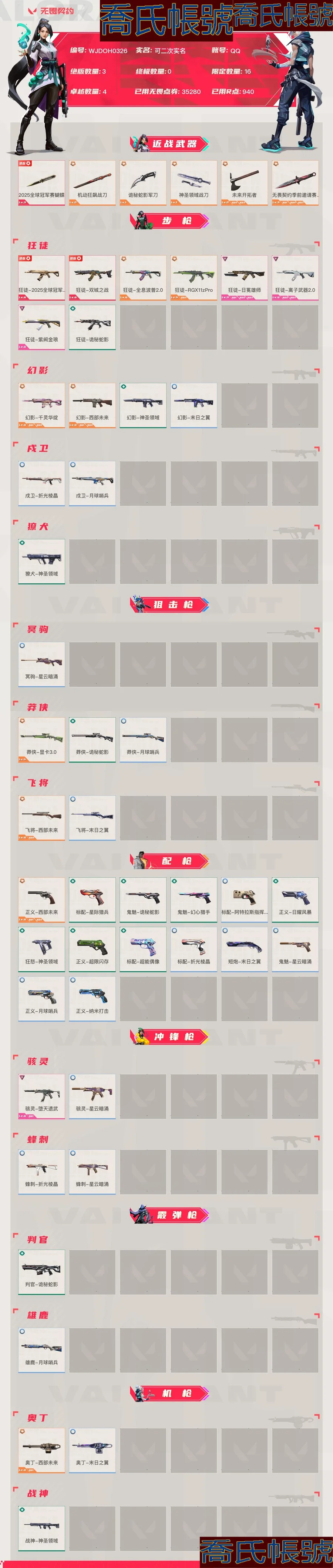 【OBWJDOH032642】Lv162 鑽石II, 刀皮數量6,槍皮數量44(絕版3限定16終極0卓越4);皮膚資產價值35280,已用R點940;【刀皮】:近戰武器-2025全球冠軍賽蝴蝶刀,近戰武器-機動狂飆戰刀,近戰武器-詭秘蛇影軍刀,近戰武器-神聖領域戰刀,近戰武器-未來開拓者,近戰武器-無畏契約季前邀請賽悲憫之刃; 【槍皮】:狂徒-2025全球冠軍賽,狂徒-雙城之戰,正義-西部未來,狂徒-全息波普2.0,狂徒-RGX11zPro,幻影-千靈華綻,幻影-西部未來,飛將-西部未來,莽俠-顯示卡3.0,奧丁-西部未來,駭靈-墮天遺武,狂徒-日冕雄師,狂徒-離子武器2.0,狂徒-紫闕金琅,標配-星際獵兵,鬼魅-詭秘蛇影,判官-詭秘蛇影,狂徒-詭秘蛇影,莽俠-詭秘蛇影,幻影-神聖領域,獠犬-神聖領域,正義-日耀風暴,正義-超限快閃記憶體,鬼魅-幻心獵手,標配-阿特拉斯指揮部,標配-超能偶像,狂怒-神聖領域,戰神-神聖領域,幻影-末日之翼,戍衛-折光稜晶,戍衛-月球哨兵,冥駒-星雲暗湧,莽俠-月球哨兵,飛將-末日之翼,正義-月球哨兵,正義-奈米打擊,鬼魅-星雲暗湧,標配-折光稜晶,短炮-末日之翼,駭靈-星雲暗湧,蜂刺-折光稜晶,蜂刺-星雲暗湧,雄鹿-月球哨兵,奧丁-末日之翼;【熱門卡面】:只剃兩邊卡面,2023VCT太平洋聯賽卡面,2023VCT美洲聯賽卡面,VCTEMEA聯賽卡面,終章戰術偶像團卡面,盡情舞動卡面,V25巴黎序曲卡面,駭靈設計圖卡面,三重威脅卡面,開拓者卡面,5週年為何而戰卡面,禁滅工牌卡面,終章TB-01戰術巨熊卡面,觸不可及卡面,再火一回卡面,身陷蝰腹卡面,5週年掌控全域性卡面,2025全球冠軍賽卡面,哨衛者之領域卡面,第五季異界洞開卡面,大軍“鴨”境卡面,第四季破局時刻卡面,終章5週年破碎卡面,5週年決意卡面,化繭成蝶卡面,夜露vs不死鳥卡面,歸鄉斯凱卡面,5週年消滅源能者卡面,5週年薪火初燃卡面,是不是哥們卡面,5週年卡面,親手縫製卡面,孤獨派對卡面,狂歡就現在卡面,設計草圖卡面,瑟瑟發抖卡面,喝杯奶茶解解壓卡面,末日之翼卡面,詭秘蛇影卡面,嚼嚼小零食卡面,兔截棍卡面,吃飯的本事卡面,幻稜工牌卡面,脫脂牛奶卡面,完好陳列卡面,貴賓限行設計圖卡面,稜彩通道卡面,勢不可擋星礈卡面,擲骰子決定先攻吧卡面,月球哨兵卡面,神聖領域卡面,星雲暗湧卡面,還是老一套卡面,鈦狐工牌卡面,莽俠設計圖卡面,宇宙大戰卡面,先驅者卡面,西部未來卡面,仿生摺疊學習卡面,靈蛇賀春卡面,晚五朝九卡面,朝九晚五卡面,光輝雙人組卡面,手柄給我卡面,午後燒烤卡面,進入射程卡面,2024改變者全球冠軍賽卡面,我眼中的世界卡面,我見識過的恐懼卡面,雙城之戰擁抱卡面,歡迎來到底城卡面,雙城之戰金克絲卡面,精靈大戰卡面,南瓜盛典卡面,VCTCN首冠卡面,戰術打碟卡面,逮到一個卡面,修車達人卡面,熱舞環節卡面,戰繩燃脂卡面,正義的化身卡面,鐵之華卡面,聲感陷阱設計圖卡面,時間到卡面,最高舞臺卡面,新兵報到卡面,代號紅色卡面,V契約卡面,夢幻奶茶卡面,無畏契約卡面;【熱門掛飾】:永結同心掛飾,電擊搖滾掛飾,V25第六幕紀念幣掛飾,致命劑量掛飾,淡定鴨掛飾,2025全球冠軍賽掛飾,蘆葦掃帚掛飾,V25第五幕紀念幣掛飾,鹽晶掛飾,來點下飯菜掛飾,紅鱗松葉掛飾,新型引擎掛飾,盆栽掛飾,V25第四幕紀念幣掛飾,5週年掛飾,捏捏球掛飾,內測金鑰掛飾,歡樂餃子掛飾,V25第三幕紀念幣掛飾,奪命毒蠍掛飾,樹懶戰術掛飾,神中神掛飾,末日之翼掛飾,詭秘蛇影掛飾,誘捕陷阱掛飾,鮮蝦手握掛飾,袖珍炮塔掛飾,折光稜晶掛飾,V25第二幕紀念幣掛飾,海豹的認可掛飾,太空熊熊掛飾,小小行星掛飾,星雲暗湧掛飾,驚嚇奶牛掛飾,激光槍掛飾,神聖領域掛飾,西部未來掛飾,走神掛飾,熱氣騰騰掛飾,V25第一幕紀念幣掛飾,悠閒雞塊掛飾,傘繩掛飾,雙城之戰小蛋糕掛飾,第九季第三幕紀念幣掛飾,終章KO小金人掛飾,工具腰帶掛飾,Z世代特飲掛飾,魚骨頭掛飾,熔岩燈掛飾,掛一掛掛飾,瞬雲履掛飾,第九季第二幕紀念幣掛飾,終章這瓜保熟掛飾,天外飛客掛飾,糖葫蘆掛飾,迷你濃縮掛飾,第九季第一幕紀念幣掛飾,無畏契約紀念幣掛飾,袖珍捷風掛飾;【熱門噴漆】:技能裡面洗澡噴漆,身負重任噴漆,高歌一曲噴漆,五週年快樂噴漆,風暴湧動噴漆,乳酪陷阱噴漆,碰個拳噴漆,2025全球冠軍賽噴漆,鴨鴨聽命噴漆,出其不意噴漆,松葉噴漆,蛇出沒注意噴漆,無人之境噴漆,酥脆一擊噴漆,扶額噴漆,5週年噴漆,暗中觀察噴漆,幸運小虎噴漆,轉個蝴蝶刀先噴漆,先走一步噴漆,睡前哭哭噴漆,毫無破綻噴漆,無處可逃噴漆,決鬥通牒噴漆,詭秘蛇影噴漆,末日之翼噴漆,看鬍子猜人噴漆,致命綻放噴漆,辣到眼睛了噴漆,滅蟲專家噴漆,折光稜晶噴漆,保持低調噴漆,閱後即焚噴漆,破梗復興噴漆,旋轉門噴漆,我摯愛的傑作噴漆,捲心菜之靈噴漆,汗流浹背噴漆,塗鴉速度噴漆,嗨寶飛濺噴漆,困來如山倒噴漆,真煩人噴漆,神聖領域噴漆,貓貓錯了噴漆,子彈時間噴漆,月球哨兵噴漆,星雲暗湧噴漆,就你和我噴漆,西部未來噴漆,GG彈噴漆,年年有芋噴漆,大打出爪噴漆,完美得分噴漆,嗨寶南瓜燈噴漆,易如反掌噴漆,鬱悶刷屏噴漆,都算到了噴漆,控場勿近噴漆,小丑貓噴漆,熊抱噴漆,尷尬時刻噴漆,買裝還是存錢噴漆,驚聲尖叫噴漆,水晶球噴漆,2021冠軍巡迴賽花火噴漆,拼一槍噴漆,超級粉絲噴漆,勝利屬於無畏契約噴漆,GLHF噴漆,捷風差距噴漆,無畏契約噴漆;【皮膚可能含有某些特權皮膚,具體以遊戲內實際擁有為準】