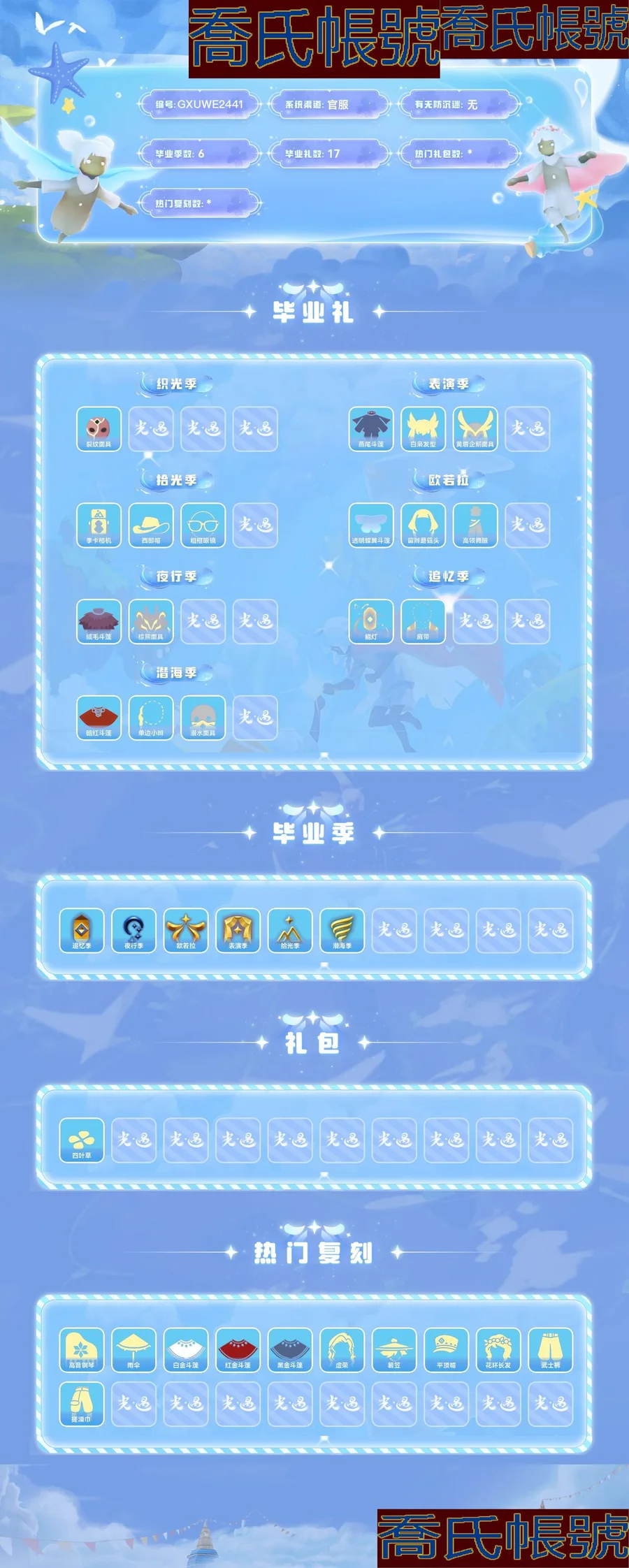 【OBGXUWE244142】蠟燭0,愛心49,季蠟0,昇華蠟燭21,光翼78,畢業季:追憶季,夜行季,歐若拉,表演季,拾光季,潛海季;畢業禮:季卡相機,鯤燈,絨毛斗篷,燕尾斗篷,透明蝶翼斗篷,暗紅斗篷,白梟髮型,留辮蘑菇頭,西部帽,單邊小辮,潛水面具,裂紋面具,黃眉企鵝面具,棕熊面具,粗框眼鏡,肩帶,高領舞服;禮包:四葉草;熱門復刻:高音鋼琴,雨傘,白金斗篷,紅金斗篷,黑金斗篷,虛榮,箬笠,平頂帽,花環長髮,武士褲,搓澡巾;;【官服】【系統】