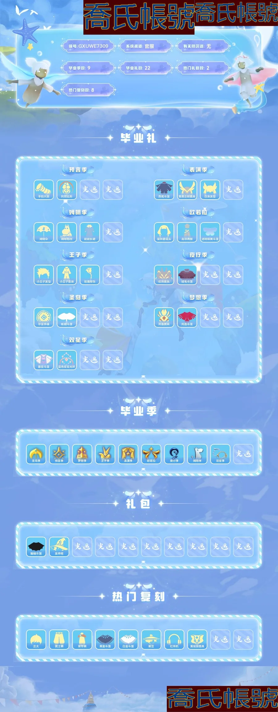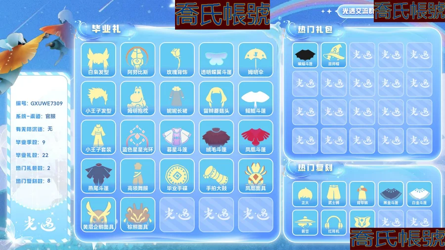 【OBGXUWE730942】蠟燭749,愛心105,光翼164;畢業季:聖島季,預言季,夢想季,王子季,表演季,歐若拉,夜行季,姆明季,雙星季;面具:阿努比斯,黃鼠狼面具;斗篷:白金斗篷,黑金斗篷,蝙蝠斗篷;髮型:正太;褲子:武士褲,背帶褲;帽子:巫師帽,紅耳機,箬笠;【官服】