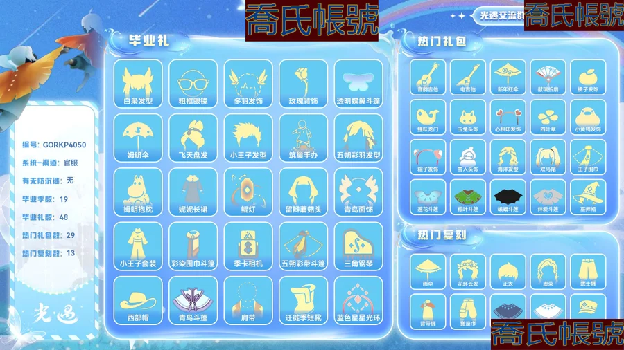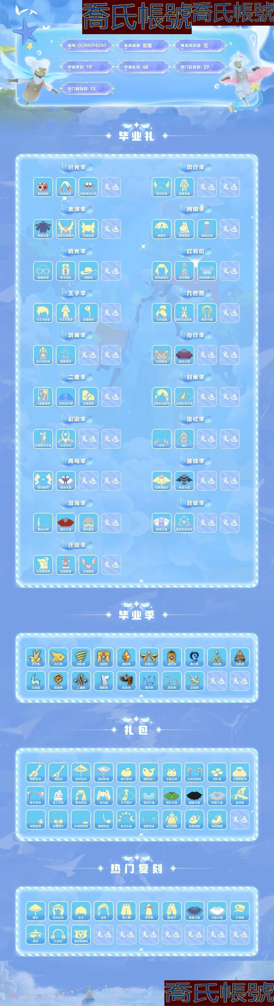 【OBGORKP405042】蠟燭1193,愛心103,昇華蠟燭27,光翼174;畢業季:王子季,風行季,潛海季,表演季,破曉季,歐若拉,追憶季,夜行季,拾光季,歸巢季,九色鹿,築巢季,二重奏,姆明季,彩染季,青鳥季,雙星季,遷徙季,織光季;面具:黃鼠狼面具,彩染畢業,潛水面具,青鳥面飾,遷徙面具,棕熊面具,羚羊面具;斗篷:蝙蝠斗篷,王子圍巾,絆愛斗篷,白金斗篷,蓮花斗篷,粽葉斗篷,黑金斗篷;髮型:白梟髮型,正太,虛榮,花環長髮,雙馬尾,海洋髮型,小王子髮型;耳飾:金鱗耳墜;眼鏡:星月頭冠,粗框眼鏡;頭飾:玉兔頭飾,四葉草,心相印發飾,橘子髮飾,鯉躍龍門,單邊小辮,粽子髮飾,小黃鴨髮飾,雪人頭飾;項鍊:姆明飾品,優雅領巾,水母塔肩飾,樹精肩飾;鞋子:玉兔拖鞋,悅動跑鞋,遷徙季短靴;褲子:武士褲,背帶褲,搓澡巾;帽子:巫師帽,紅耳機,箬笠,西部帽,平頂帽;衣服:小王子套裝,光之生物;背飾:玫瑰背飾,雨傘,築巢手辦,追光傘,音韻吉他,新年紅傘,獻瑞摺扇,電吉他,小號,姆明抱枕,季卡相機;【官服】