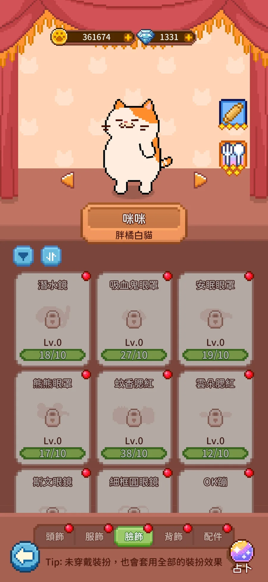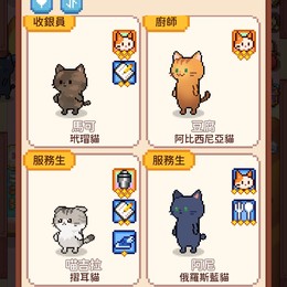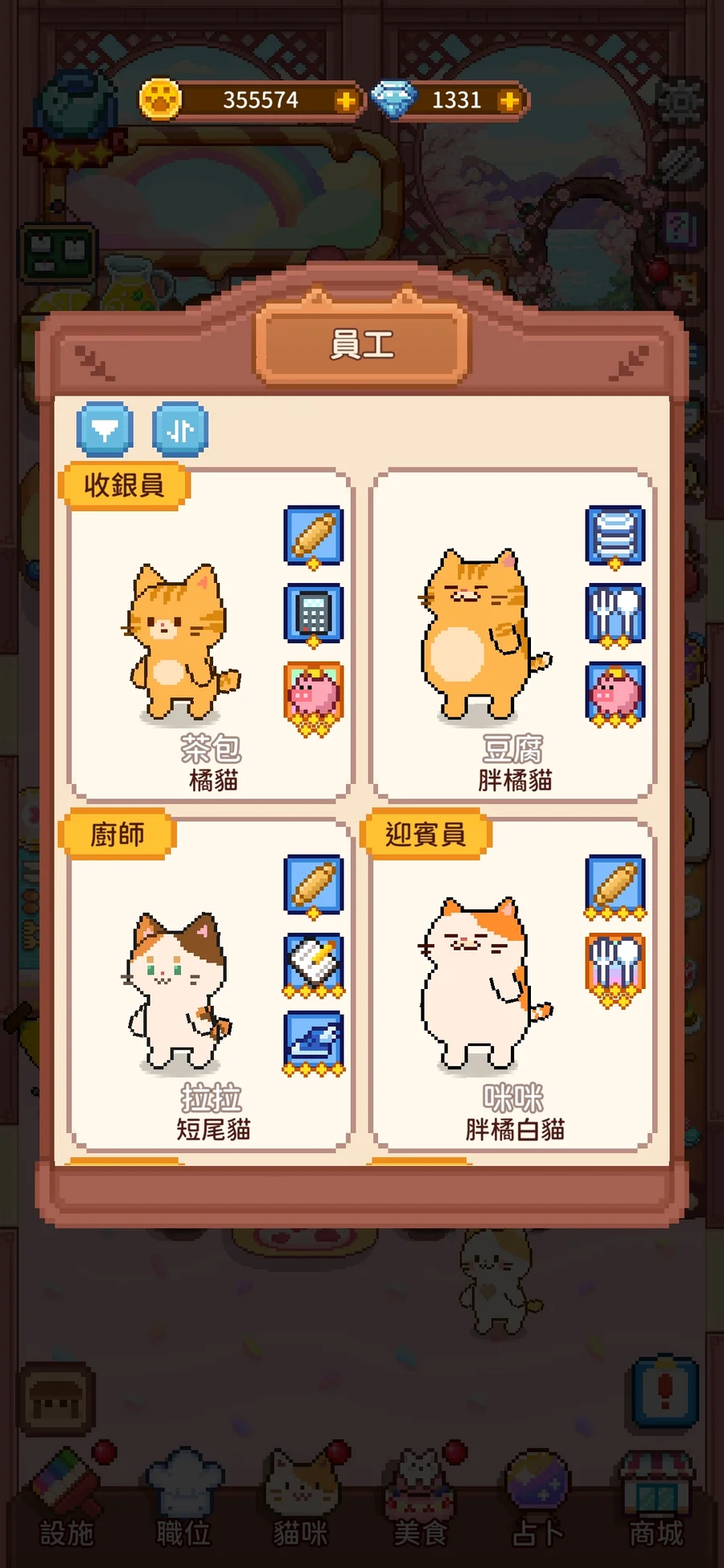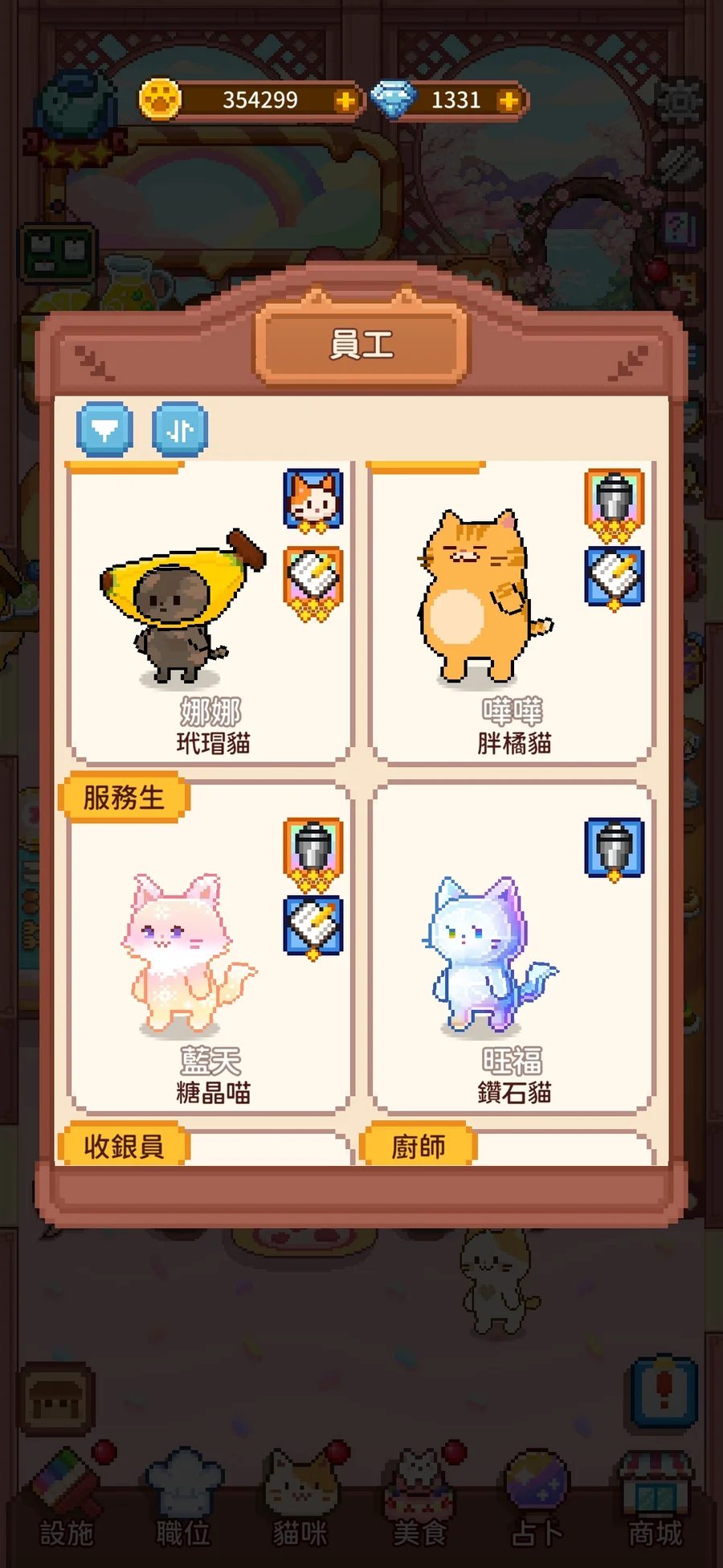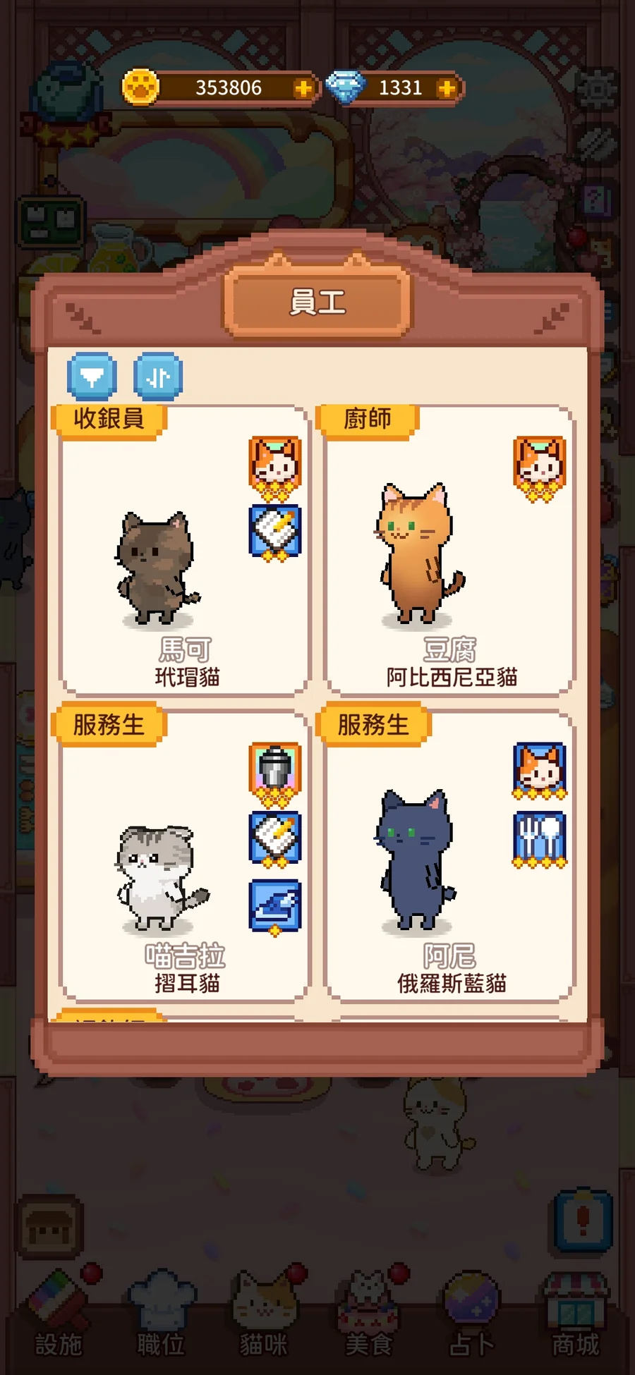 如圖,設施,大廳,廚房,店外,能用喵幣買的全部買齊全,純手動在玩,沒用任何不法程式,有問題問與答,會持續更新