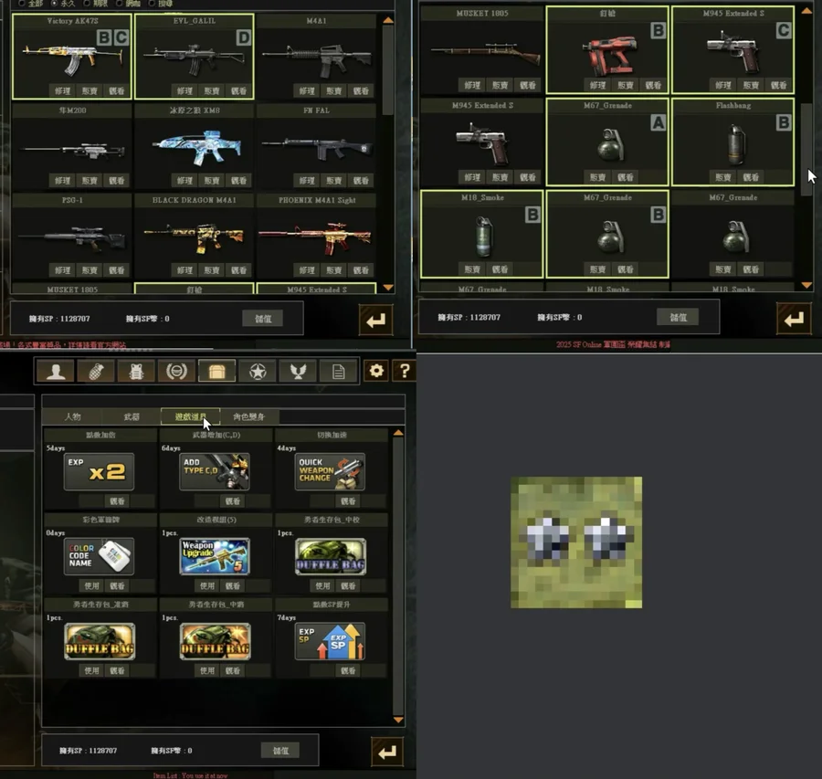 黃SVD、隼M200、白虎Galil*2、Pink AKs、Hero G36C、台灣第一PSG1-A1、聖誕UZI、FRF2、KAR98、XM8、TAC、M110、FN、MP5、AUG、小貝、小鋼炮