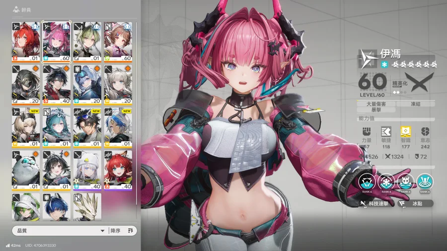 【42等、女】M9 萊萬汀+專武、伊馮、黎風1潛、艾爾黛拉、驍勇*2、同類相食、白夜、雙倍皆在
