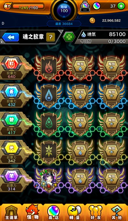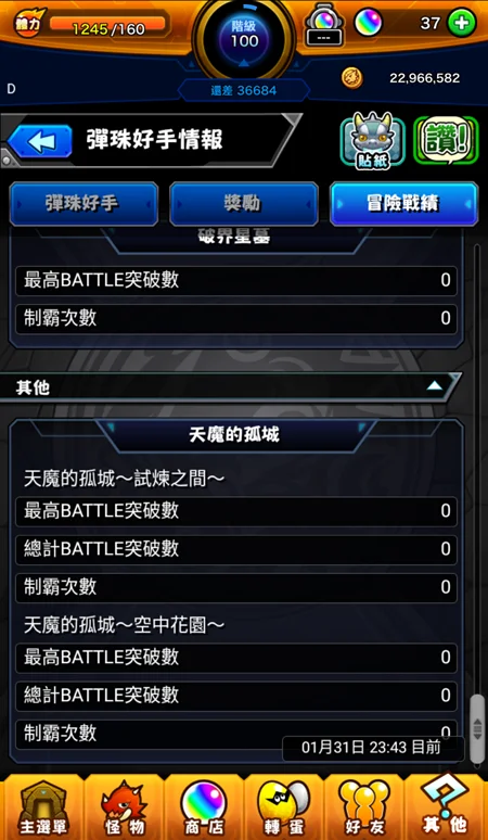 訓練冒險打完(寶珠領完.獎勵關卡沒打所以等級只有100)