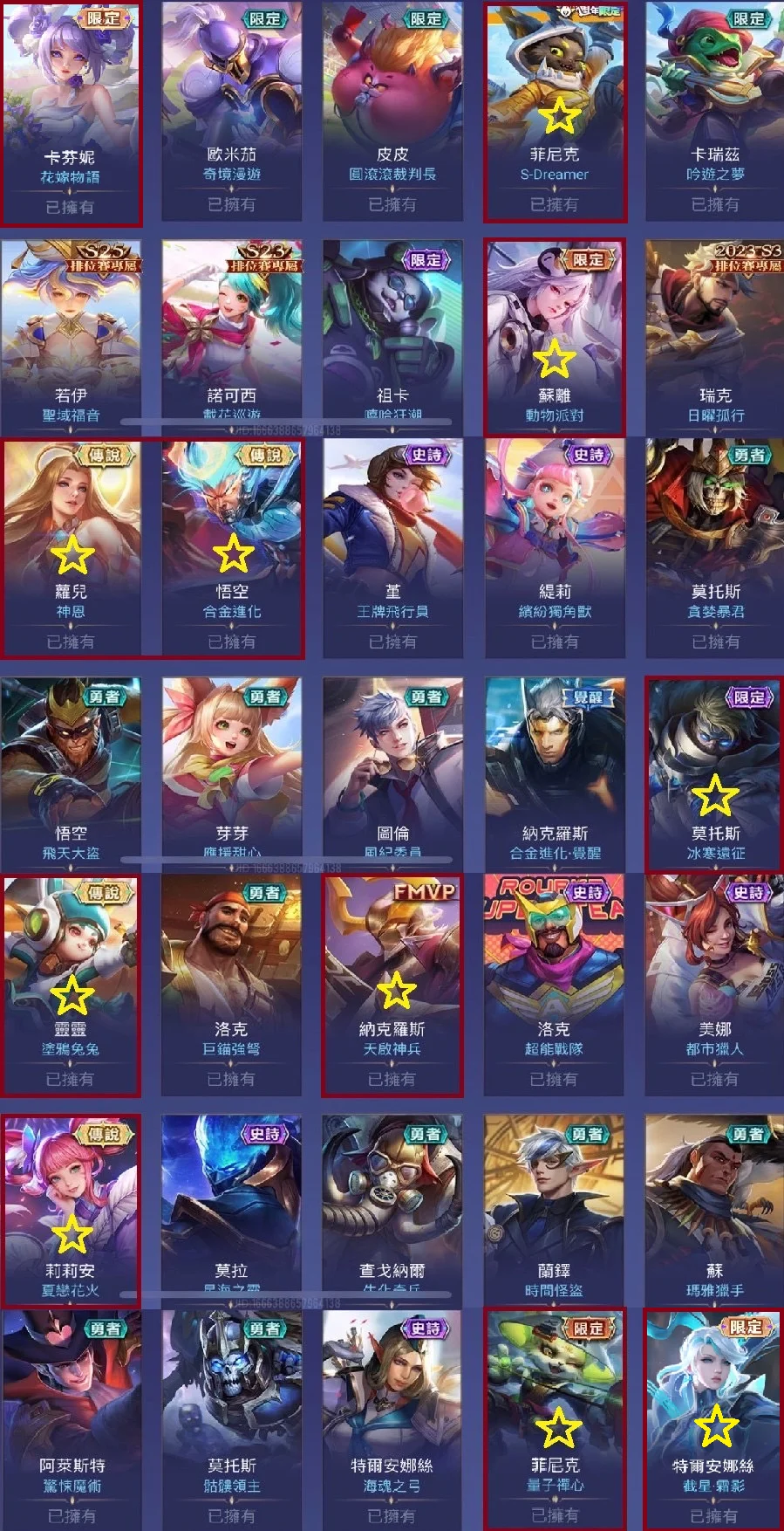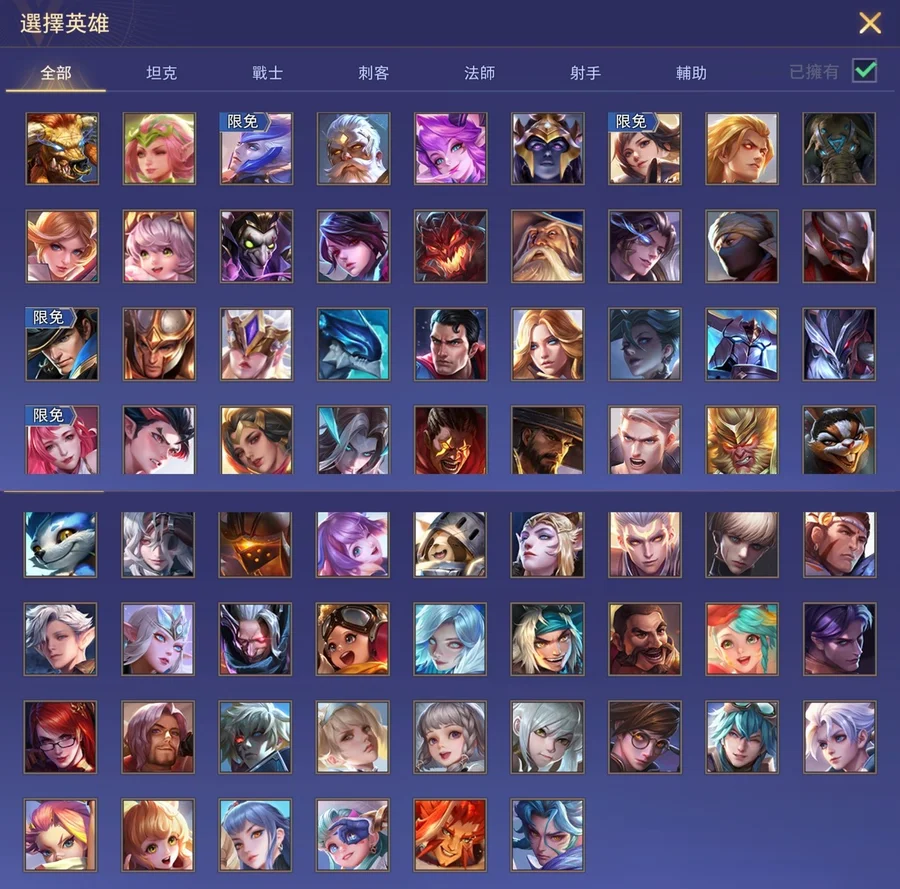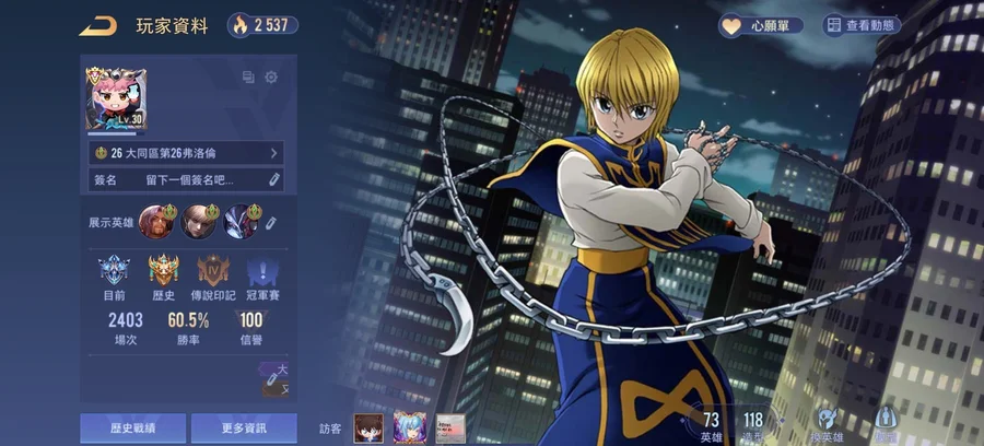 勝率佳!高CP值小神帳!共73英雄118造型!勝率近61%!!共4次S傳說戰場印記!!常用奧義皆已齊全!!