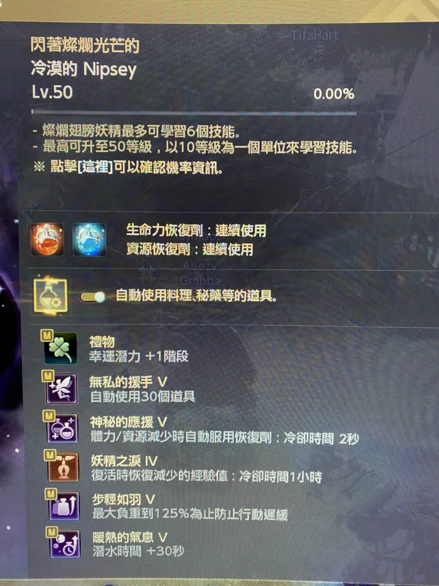 裝備進度: 主武器/輔助武器/覺醒武器 8階風(Vlll) 主, 卡拉札德飾品6件10階桓(X), 艾達納頭盔/盔甲/手套/鞋子為4件3階故(III)
