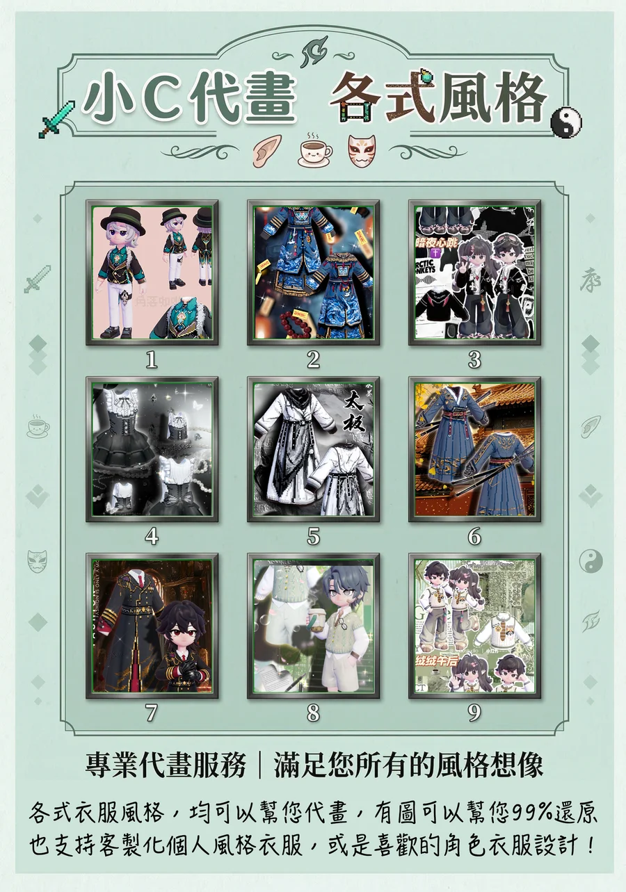 有圖可以幫您還原99.9%!也可以不一定給範例圖,如喜歡動漫角色的插畫,均可以幫您轉換成遊戲的造型!