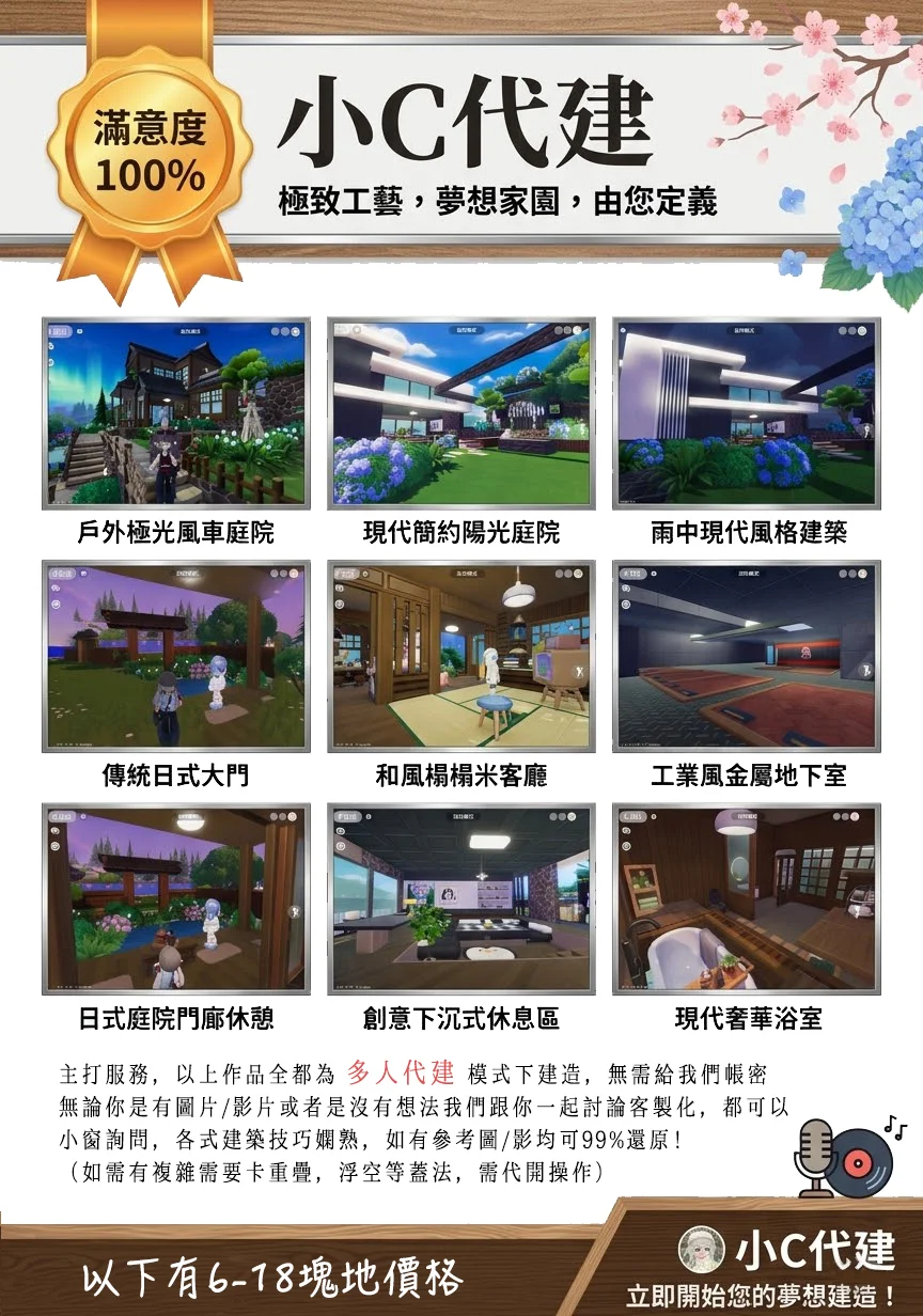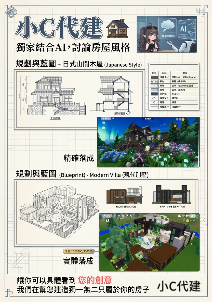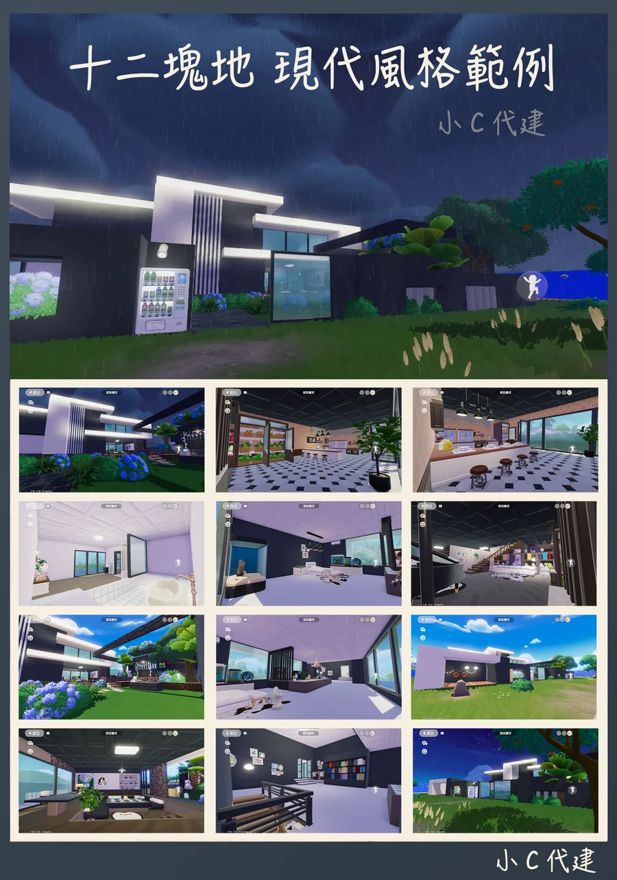 另外也主打可以使用 多人建造 模式幫您代建,可以不用代開帳號也能幫您以最快的速度蓋好房子!以上圖片範例的九塊地、十二塊地、十五塊地的範例均是使用多人建造就可以完成這個完成度的。