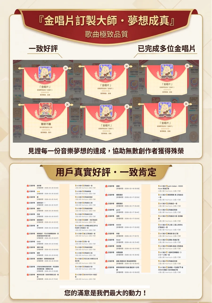 • 另有全新服務:包月訂製,每天一首歌給您,一個月30首,CP值首選,成爲您的專屬音樂家服務您