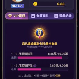 售此帳號因為不想在玩也有其他事要處理,所以出售,黑卡期限到2026/2/28每月儲值十萬可續黑卡,目前已經儲8.85萬,過年也有送幣可玩,此帳開過好幾次大獎👍,希望能快快售出!可面交請官網更改綁定電話,安全!!詐騙勿擾謝