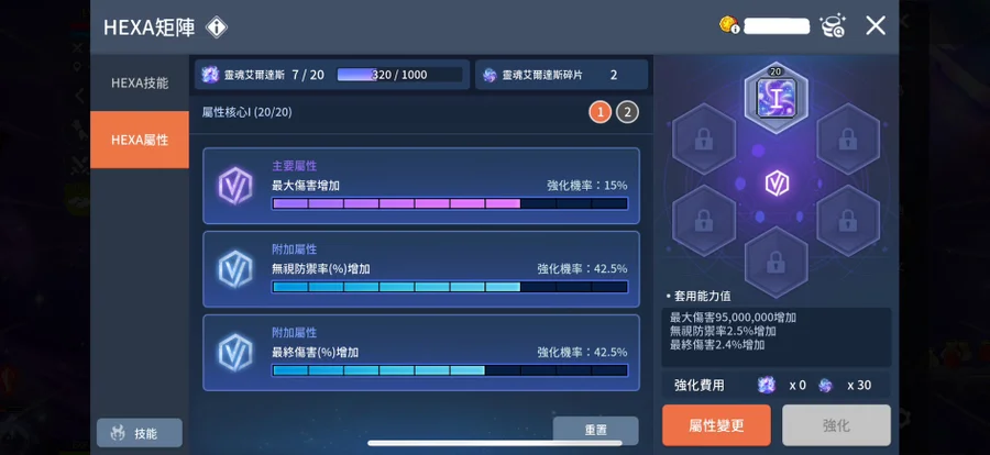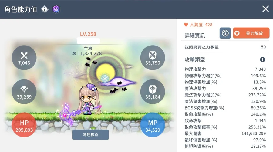角色狀態如圖(血量20.5W):死靈武吃滿表攻可達4W以上,小屋分數560(每天多30分鐘自動戰鬥),帳號內附40超死靈武(無底)+上、下衣(都罕淺)+古代經驗6件套;公會個人技能第一個hp點滿、身上裝備潛能均洗血居多(Hp共+66.2%),戰地6801,HEXA矩陣6轉目前只開天箭VI、主屬大傷7級+附加無視7級+終傷6級、極限屬性2頁一個練等&一個打王,寶珠有經驗SS+魔傷SS和王傷SS寶珠3頁、穿軍團長飾品大傷1.41E(阿卡項鍊目前4星),未售出前持續提升,歡迎大家都可以來提問+聊聊!