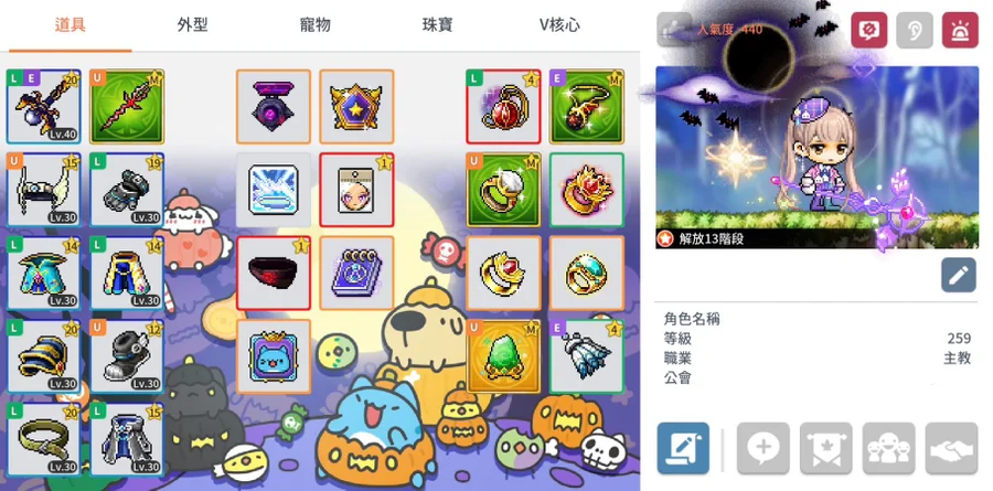 3/24更新:怪物收藏4000+3000共7000血取得、角色血量24.9W:死靈武已吃滿表攻4.73萬,分身艾伊爾有傳家爆傷死靈鐘擺、小屋分數560(每天多30分鐘自動戰鬥),帳號內附40超吃滿的死靈武(無底)+上、下衣(均傳説淺)+古代經驗6件套;公會個人技能第一個hp點滿、身上裝備潛能均洗血居多(Hp共+82.98%),戰地7336,6轉HEXA矩陣的技能目前全部都開啟1等;另主屬大傷7級+附加無視7級+終傷6級、極限屬性2頁一個練等&一個打王,寶珠有經驗SS+魔傷SS和王傷SS寶珠3頁、穿軍團長飾品大傷1.42E(阿卡項鍊目前4星、三武快可以換差太古),未售出前持續緩慢提升,歡迎大家都可以來提問+聊聊!
