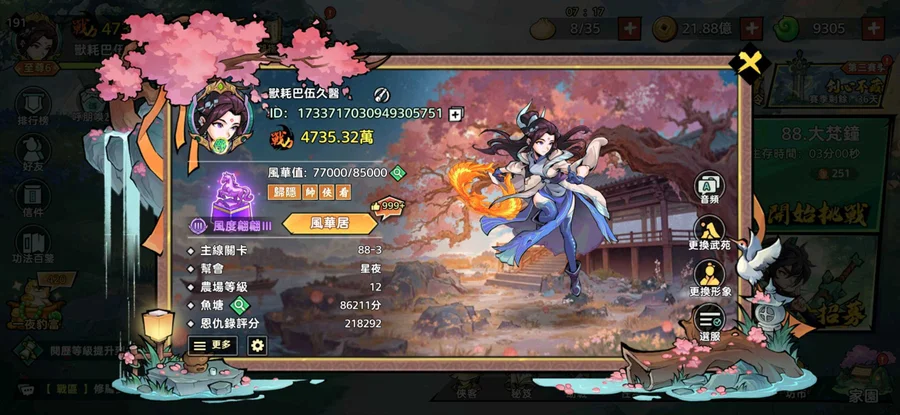 如題賣帳號,原ID:步劍平,龍門客棧13服伺服器,沒時間玩了,卓秘笈皆已6星以上,極品秘笈 力氣劍技 系皆已3星,主C為韓立,有任何問題可提出