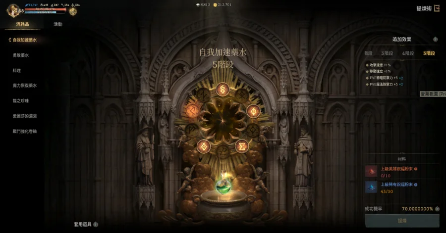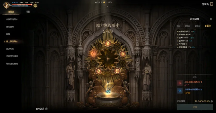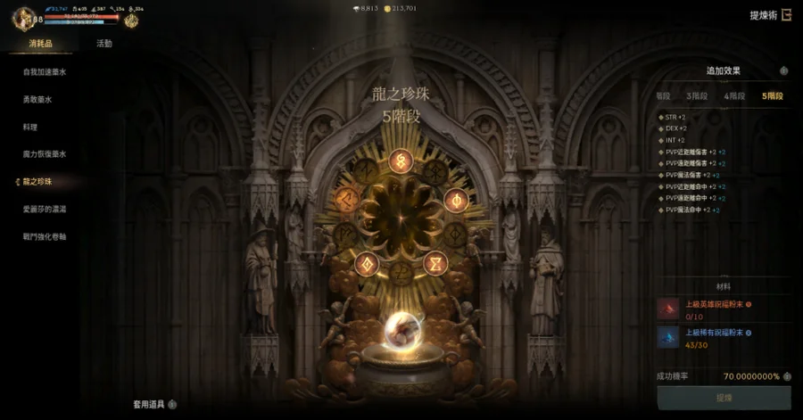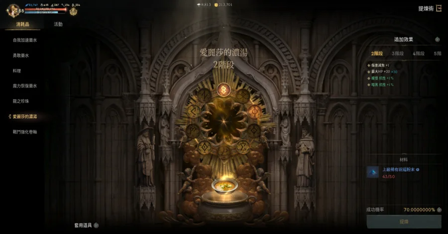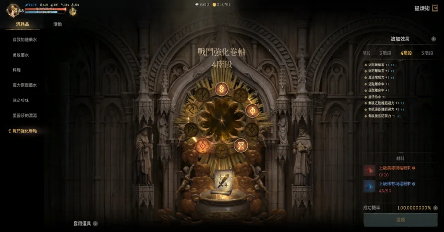【提煉術】:加速4階、勇水5階、料理4階、魔力4階、龍珠4階、濃湯1階、戰鬥捲3階