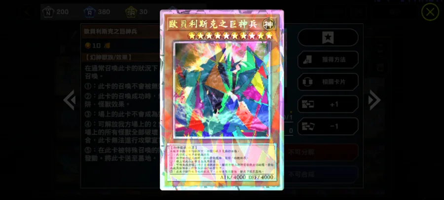 怪獸卡:灰流麗(手坑,異圖版!亮面兩張!)、效果分隔士(手坑)、幽鬼兔(手坑)、小丑與鎖鳥(手坑)、原始生命體-尼比魯(手坑)、增值的C(手坑)、黑魔導(開服限定!雙異圖版!)、歐貝利斯克的巨神兵(活動限定!異圖版!)、I:P百變萊娜(L2連結,異圖版!)、S:P小夜騎士(異圖版!)、