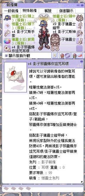 飾品套組: +4 影子邪靈爆炸耳環、影子邪靈爆炸墜子(核心破防來源,傷害倍增關鍵)
