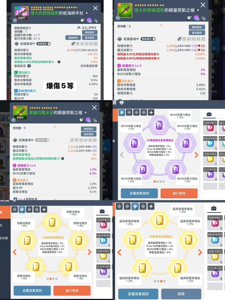 裝備:40頂級航海手杖、頂級紅火綠副武器、掉落綠副武、經驗古代白板5件