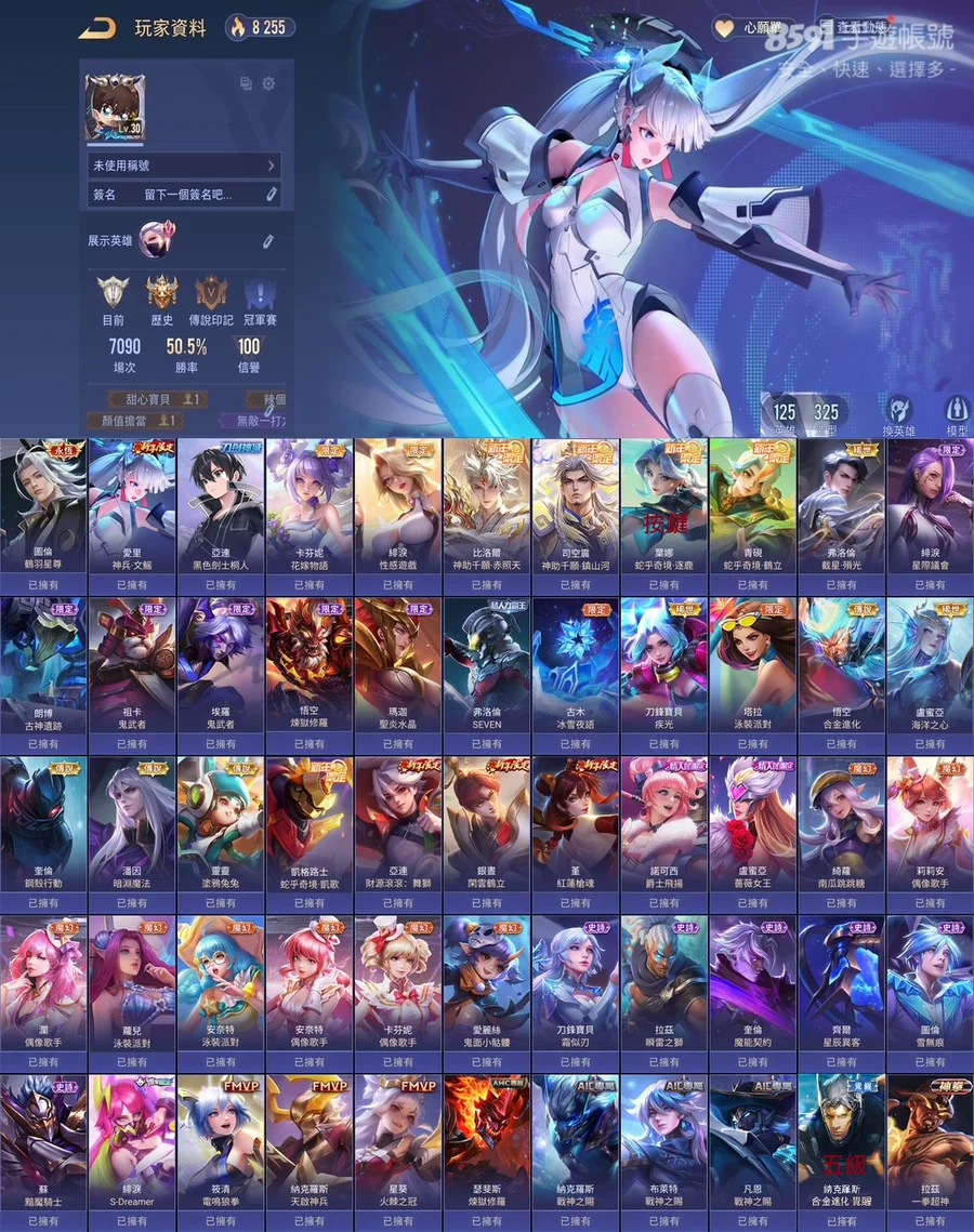 全英雄三百多造型!共125英雄325造型!勝率近51%!!共5次S傳說印記!!常用奧義皆已升滿!!