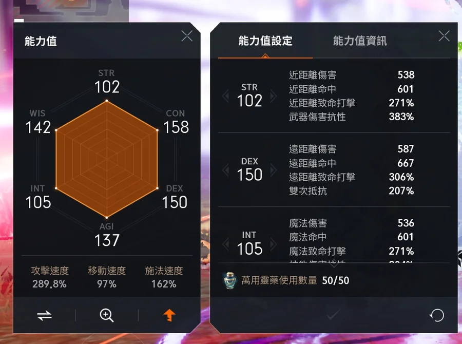 傷害551/命中636/技傷530浮動(王朝戒指可到550)/衝抗213浮動 (只拿武器+穿商城肩甲遺物,取換耳環最大值)