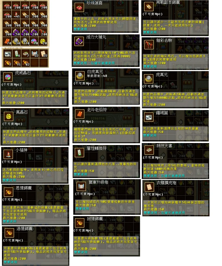 珍珠蓮霧X1158再戰副本錦囊X1462活力大補丸X458釉彩名駒X200虎威晶石X10真晶石X20虎真元X30白虎真元X110小福神X45北斗老仙符X70特技天書X7疆域圖X5屬性轉換符X6寶庫升級卷X32衣櫃擴充卷X22思憶錦囊X7追憶錦囊X15回憶錦囊X82以上全部531T下標前請先右下聊天小窗告知!