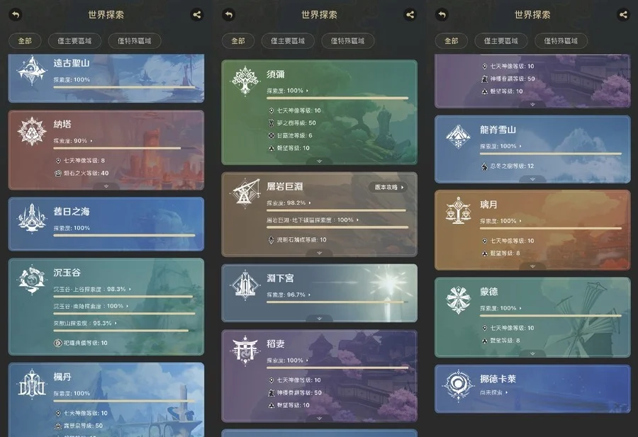 大世界探索度除了納塔90%;沉玉谷、岩層巨源差一點,其餘探索度全滿。