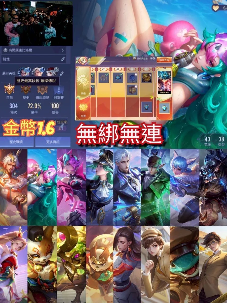 【Garena帳無綁無連、璀璨傳說、V4、43英、38造】無綁無連 歷史璀璨 雙藍標 炎融 泳裝 危情 聖誕 招財