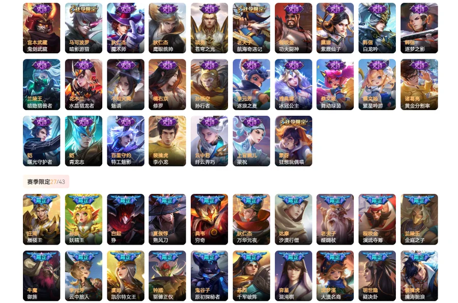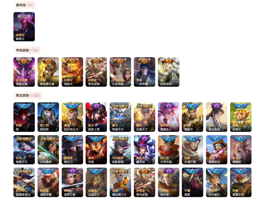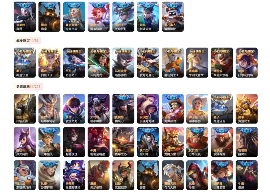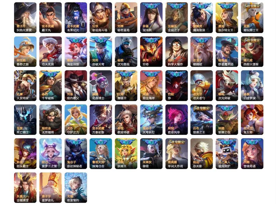 【限定皮肤54】 太乙真人谧流熔炉 西施雪境奇遇 周瑜熔金海岸 刘邦剑破天穹 鬼谷子天穹祈灯 鲁班大师探海日志 裴擒虎擒涛扼浪 孙尚香蔷薇恋人 桑启海盐诗旅 李元芳云中旅人 沈梦溪大漠名商 兰陵王金庭之子 达摩沙漠行僧 庄周高山流水 上官婉儿梁祝 孙悟空孙行者 苏烈千军破阵 老夫子航海奇遇记 墨子神迹守卫 韩信逐梦之影 钟馗驱傩正仪 程咬金演武夺筹 元歌云间偶戏 狄仁杰万华元夜 亚瑟潮玩骑士王 孙悟空零号赤焰 雅典娜单词大作战 蒙犽狂想玩偶喵 云中君纤云弄巧 裴擒虎李小龙 狄仁杰魔术师 鬼谷子原初探秘者 马可波罗暗影游猎 猪八戒西部大镖客 蔡文姬繁星吟游 赵云皇家上将 老夫子醍醐杖 明世隐疑决卦 狄仁杰阴阳师 弈星混沌棋 夏侯惇朔风刀 盾山御銮 牛魔御旌 嬴政白昼王子 吕布猎兽之王 项羽海滩派对 铠青龙志 米莱狄御霄 典韦穷奇 白起狰 虞姬凯尔特女王 孙膑妖精王 庄周蜃楼王 苏烈春野闲踪