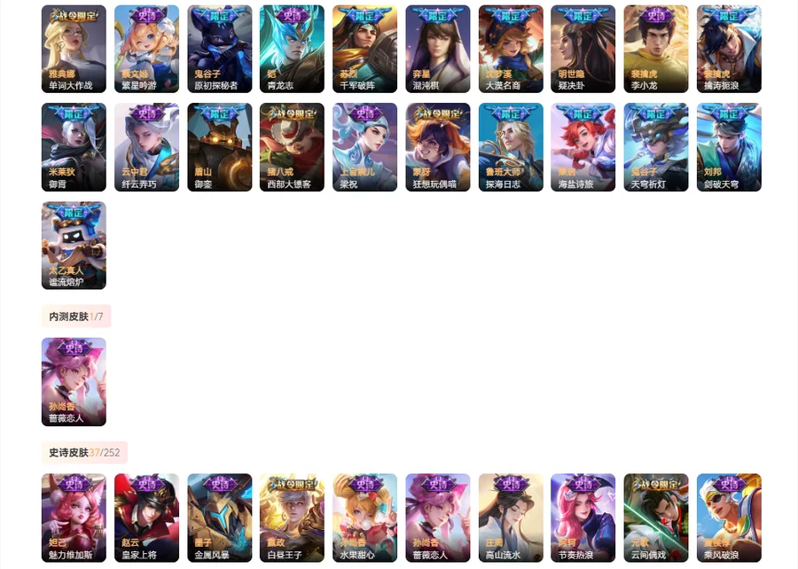 【史诗皮肤37】 李元芳逐浪之夏 孙尚香蔷薇恋人 兰陵王暗隐猎兽者 蔡文姬舞动绿茵 阿轲节奏热浪 宫本武藏鬼剑武藏 花木兰水晶猎龙者 墨子金属风暴 庄周高山流水 上官婉儿梁祝 雅典娜冰冠公主 孙悟空孙行者 不知火舞魅语 老夫子航海奇遇记 韩信逐梦之影 夏侯惇乘风破浪 元歌云间偶戏 百里守约特工魅影 蒙犽狂想玩偶喵 橘右京修罗 云中君纤云弄巧 裴擒虎李小龙 狄仁杰魔术师 马可波罗暗影游猎 蔡文姬繁星吟游 赵云皇家上将 韩信白龙吟 程咬金功夫厨神 诸葛亮黄金分割率 露娜紫霞仙子 狄仁杰鹰眼统帅 项羽苍穹之光 铠曙光守护者 孙尚香水果甜心 嬴政白昼王子 铠青龙志 妲己魅力维加斯