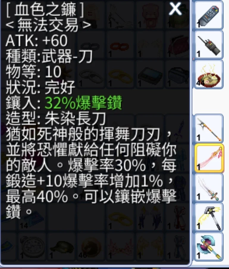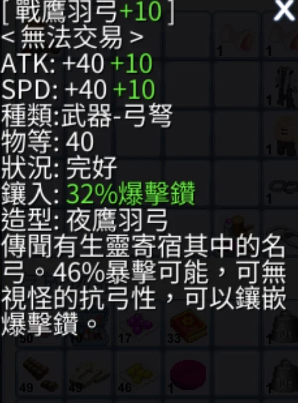 人物身上有戰鷹羽弓 鐮刀+32%爆鑽