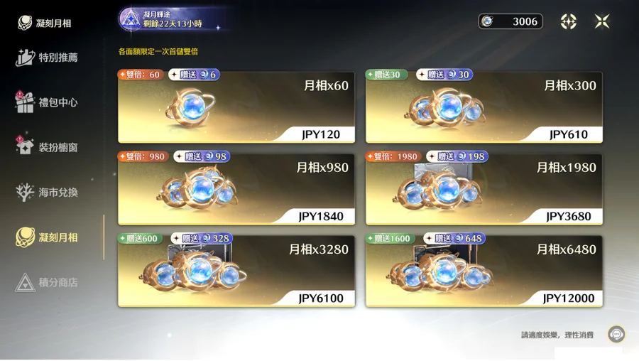 月相還有3006 相當於幫你儲好1000多塊台幣了 之後買服裝沒煩惱