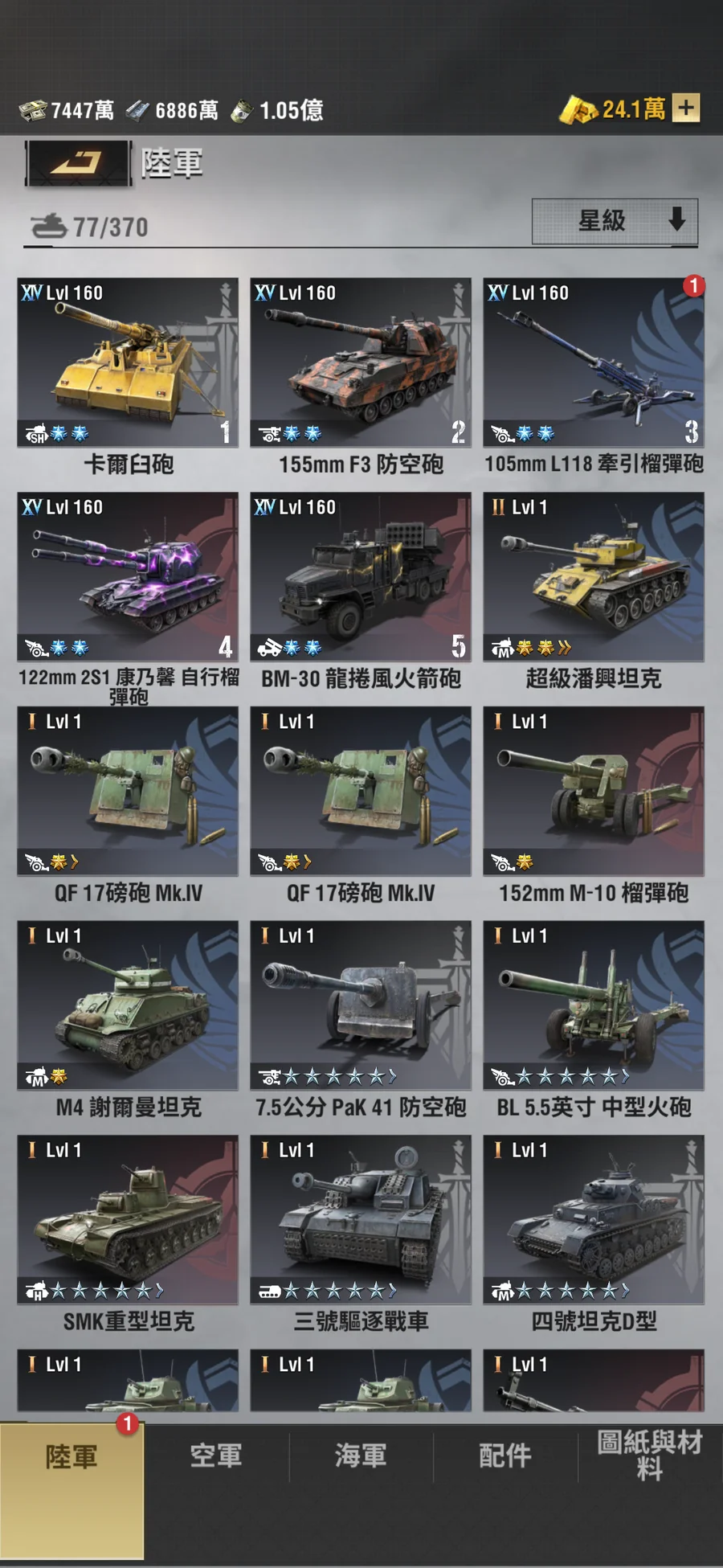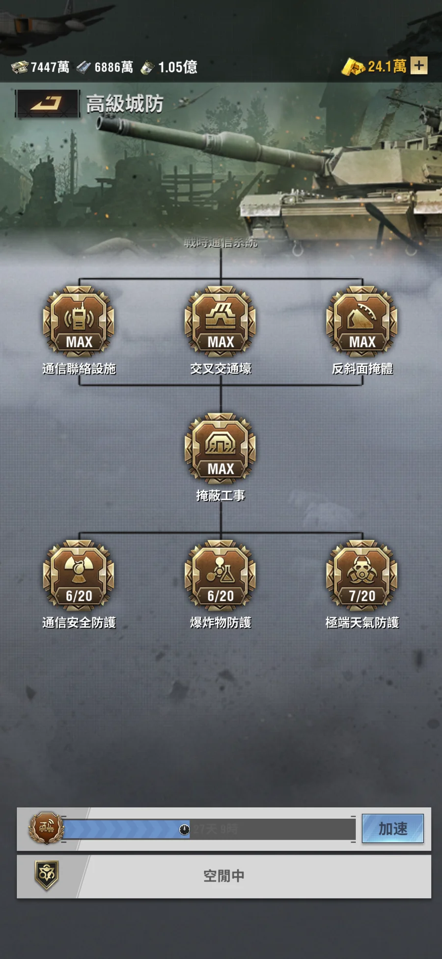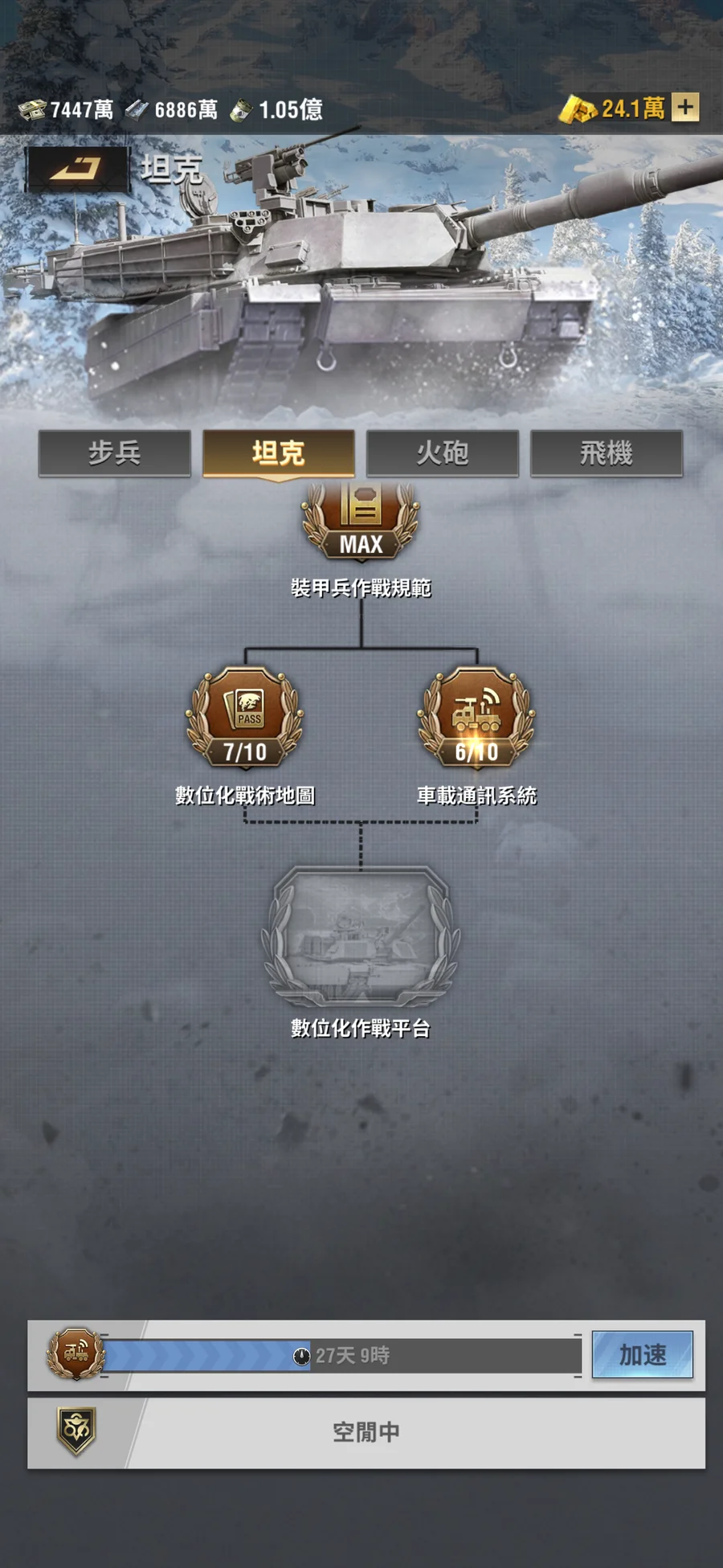 火炮科技全滿、坦克科技98%滿、飛機金科技目前完成一半、步兵金科技96%完成