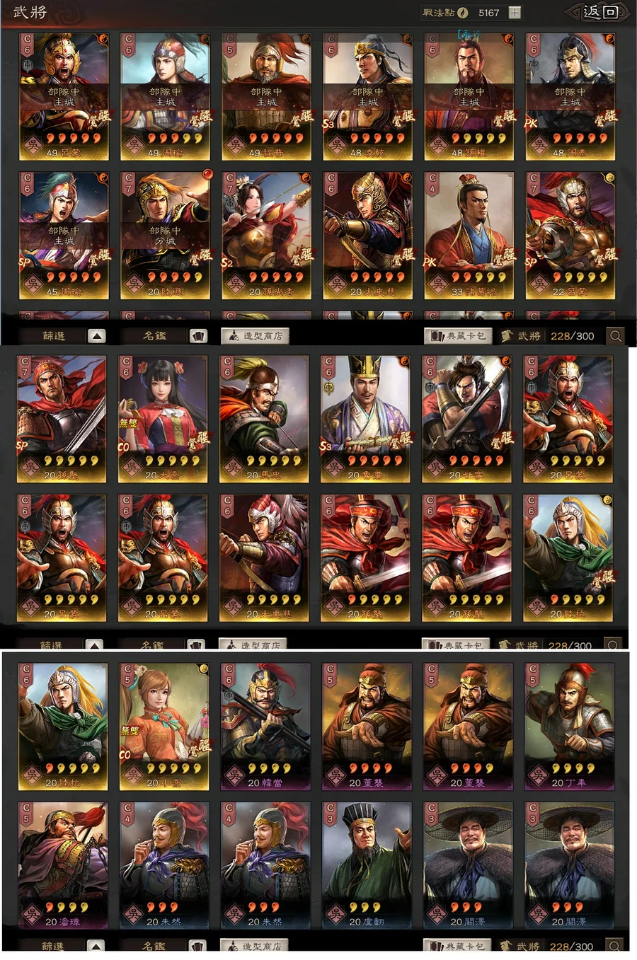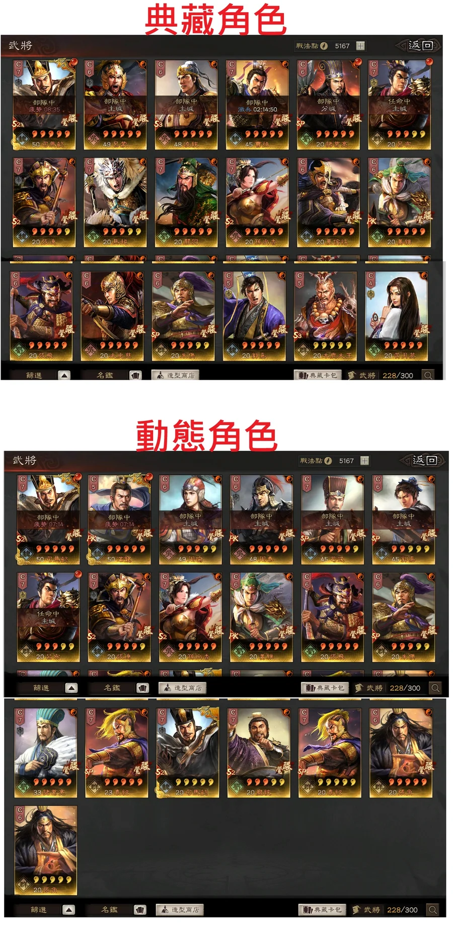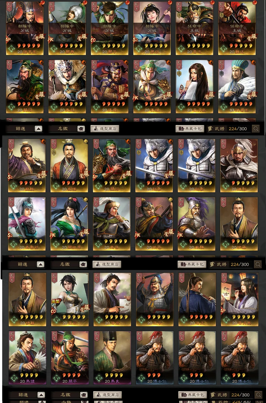 典藏角色:司馬懿,呂蒙,凌統,曹操,SP諸葛亮,呂布,張遼,馬超,關羽,孫尚香,夏侯惇,姜維,張飛,太史慈,SP朱儁,郭嘉,木鹿大王,黃月英