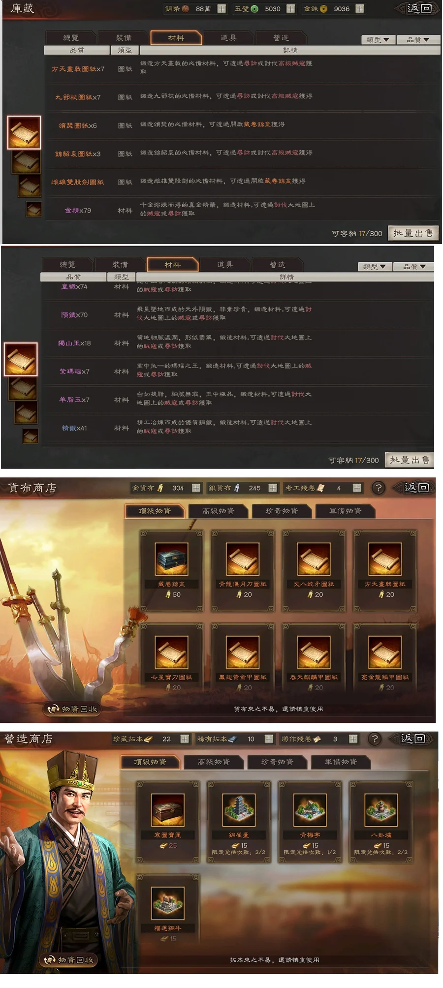 金貨布x304,銀貨布x245,考工x4,金珠玉璧約1.5萬