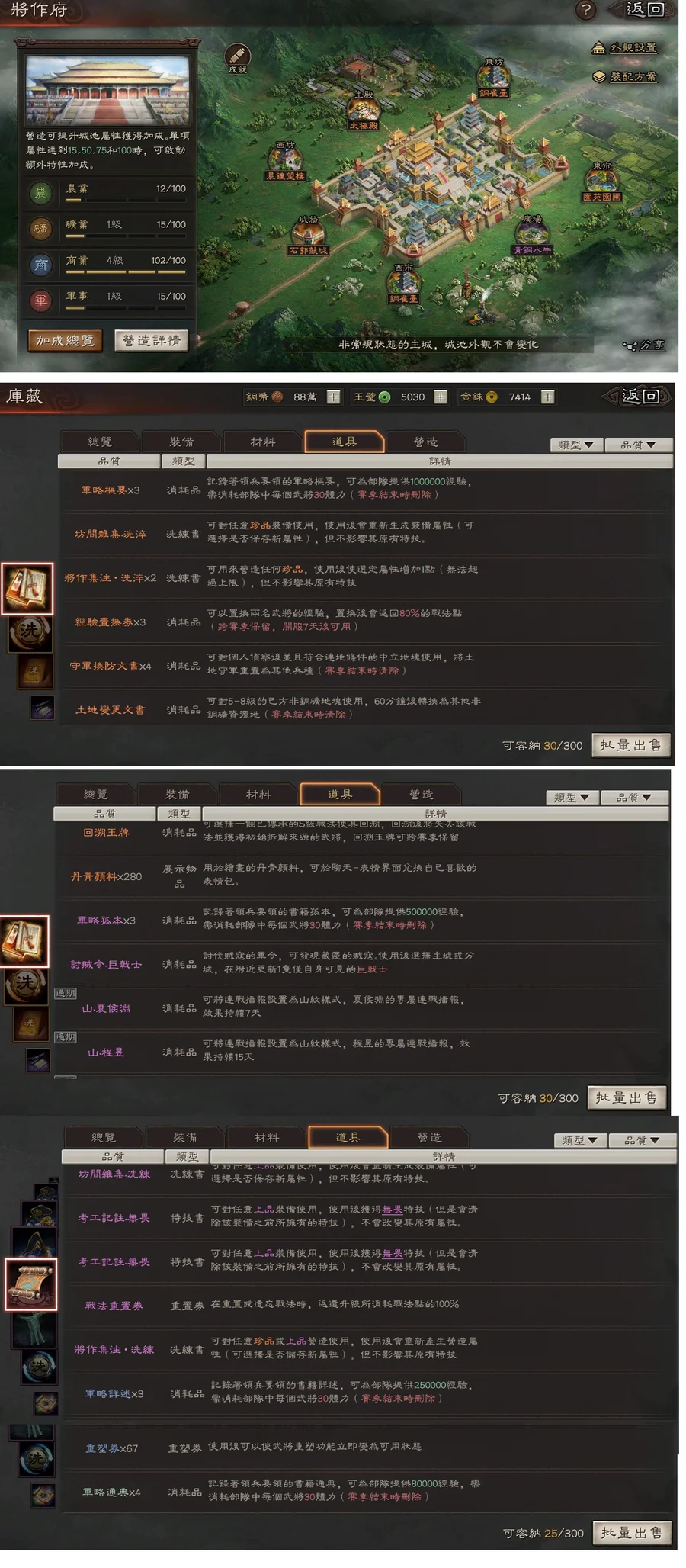 防具:3援助3靈動1雍雅,專武(司馬懿/貂蟬),其餘特技珍品防具眾多