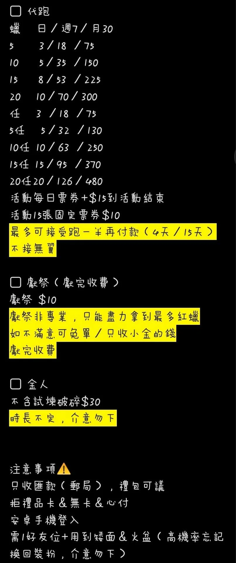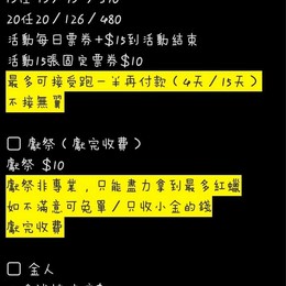 最多接受跑一半(4天/15天)再付款(禮包另議)