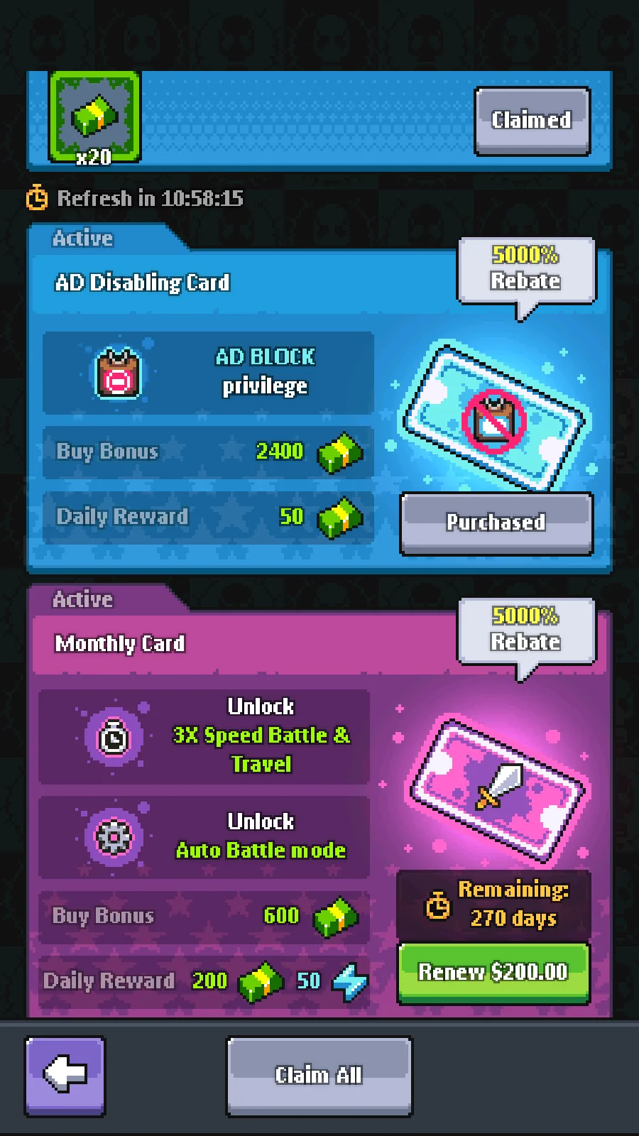21億鈔票 + 21億金幣 + 21億體力 + 21億裝備強化石 + 兩款月卡全開 = 500