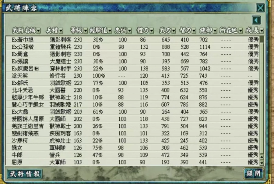 身上8頁滿/錢裝3頁滿/將格50/營帳50