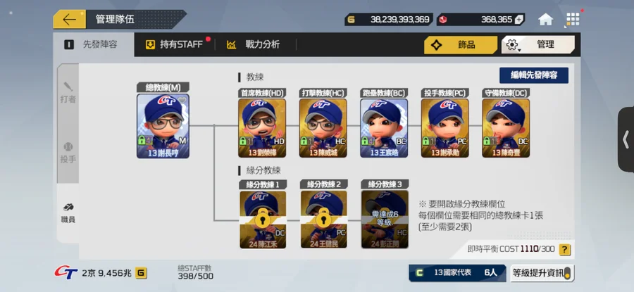 【43等】約3京 13年中華隊 皆為頂級卡階 大師裝備 最強教練 抽獎卷、錢、鑽 都很多
