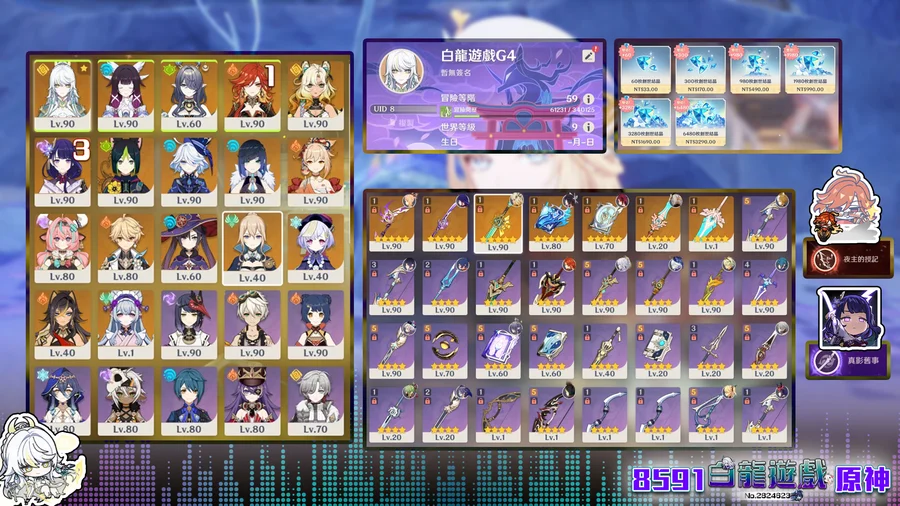 【男、59等、17金角、7金武】G4 茲白少女、雷神3+1、希諾寧0+1、火神1+0、菈烏瑪瓦雷莎水神、生日未設