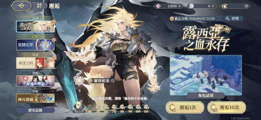 目前資源抽數:55抽+15000石(1500石10抽)共155抽