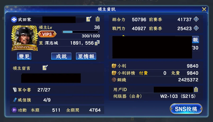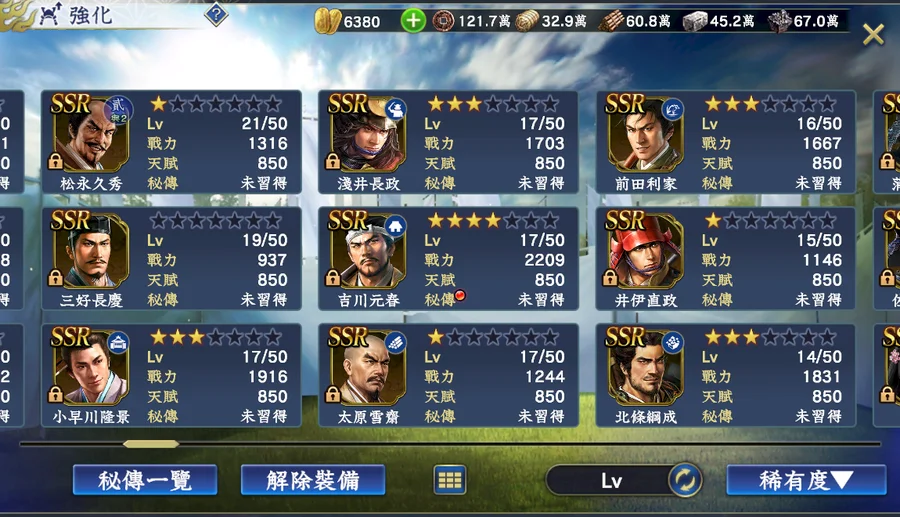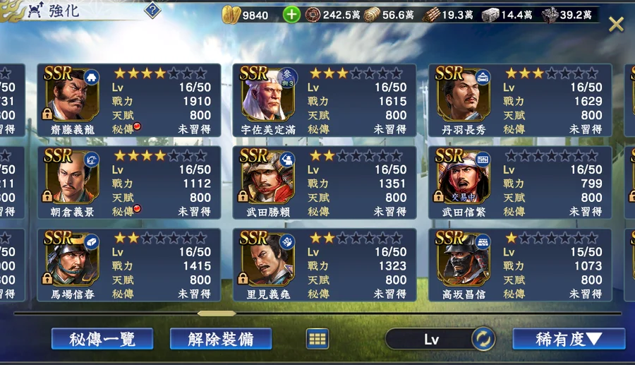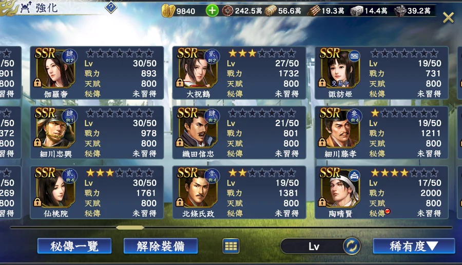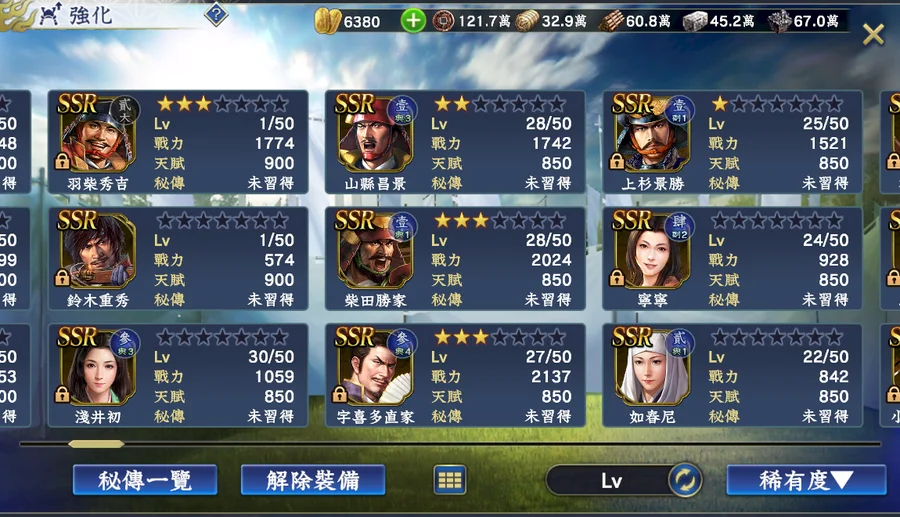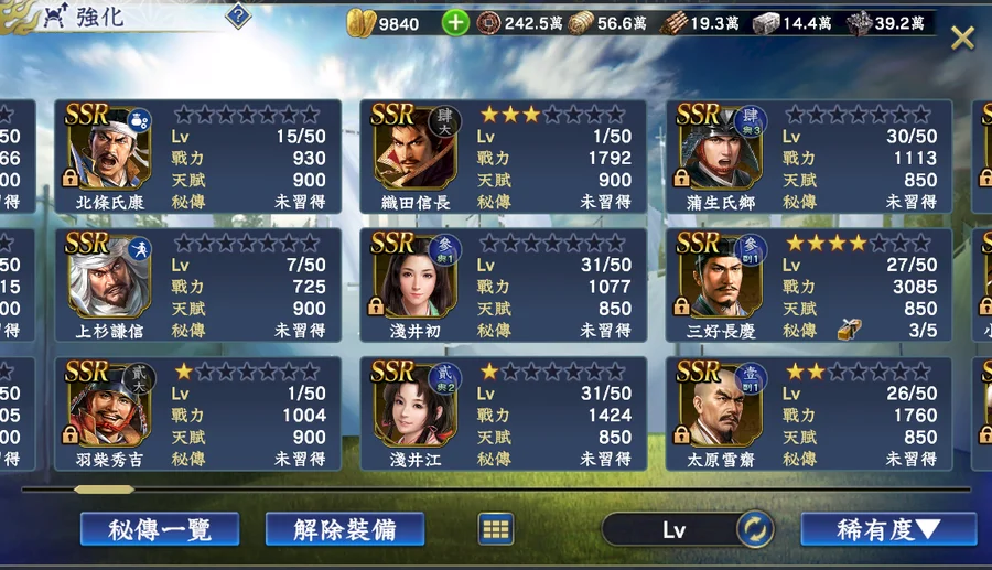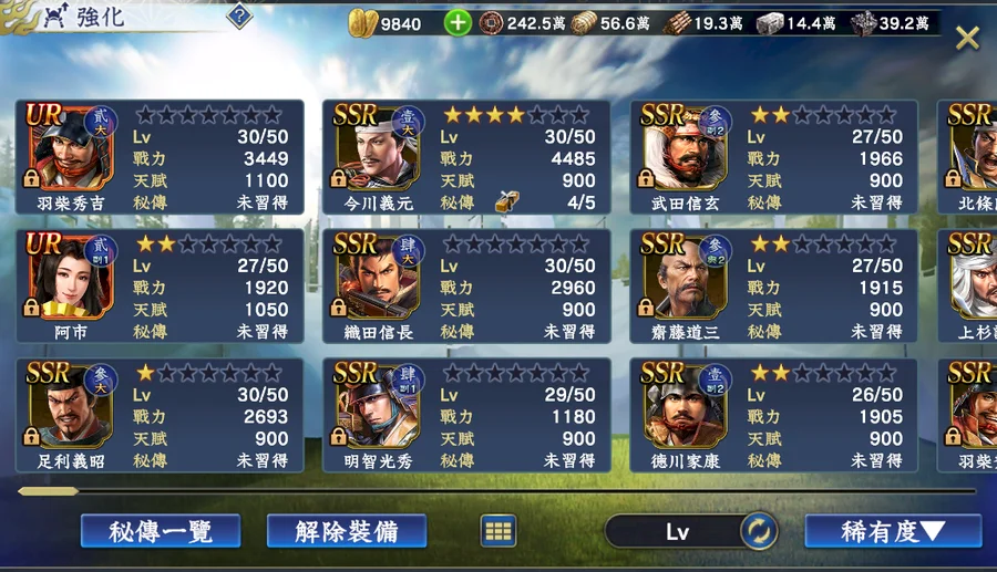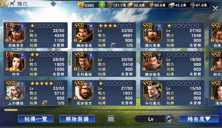 戰鬥力都4萬多,都有義昭、鐵砲信長,UR秀吉,UR阿市,軍令充足當小號也算好用的,我花時間你花小錢,喜歡的帶走