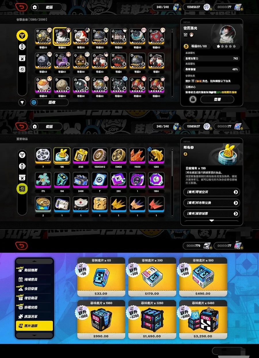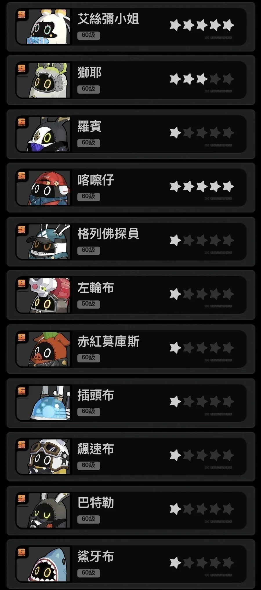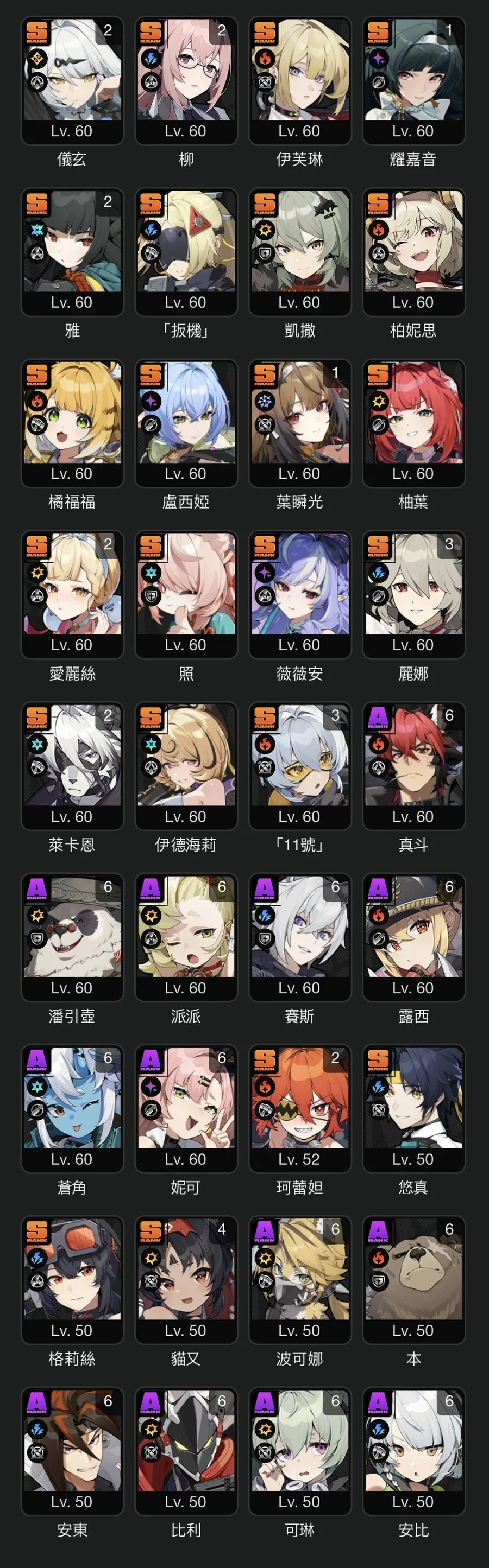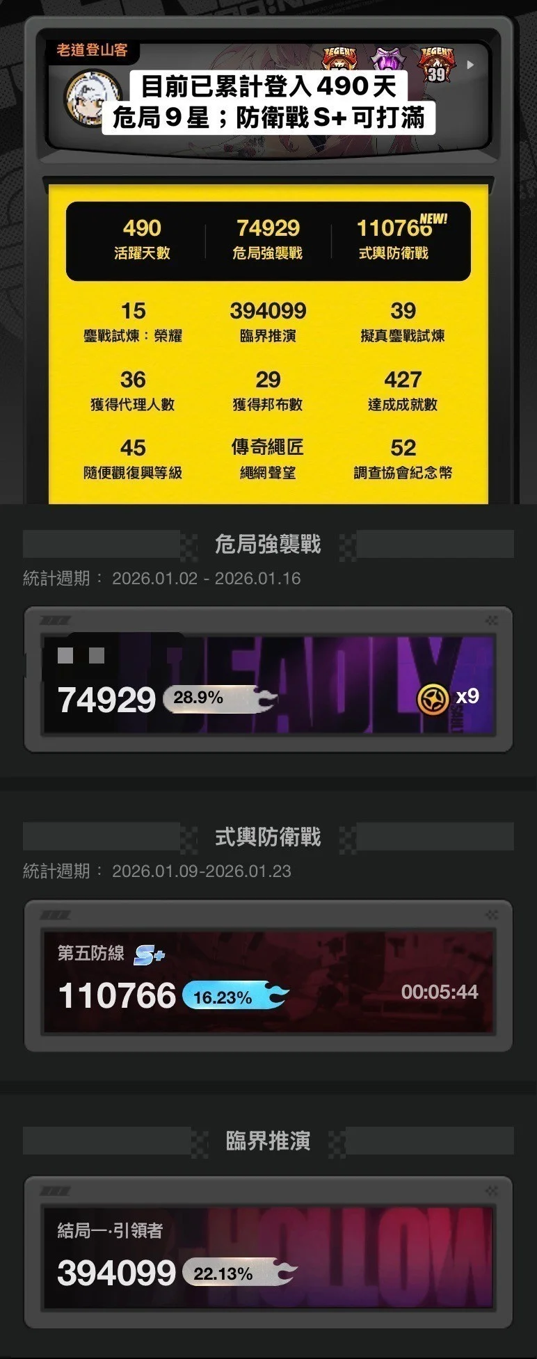 角色都有練度基本上每期危局跟防衛戰都能打滿,本期危局9星、防衛戰全S