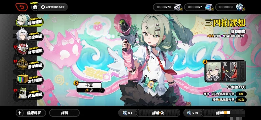 角色池大保底已墊10抽;再80抽必得當期up角。帳號內有779儲值底片。