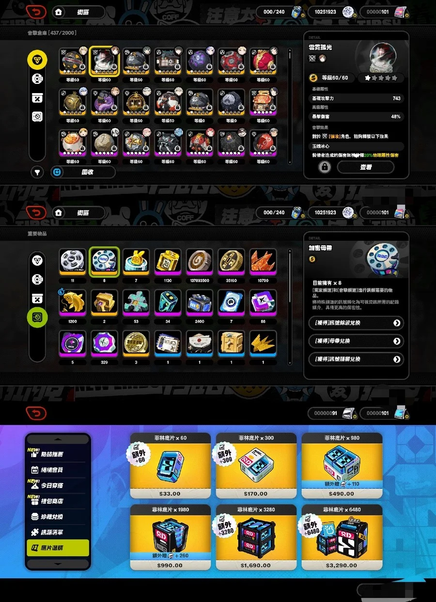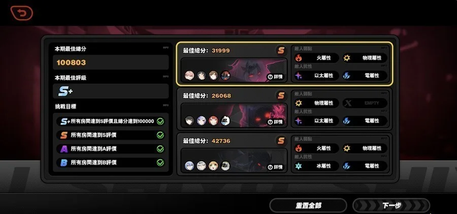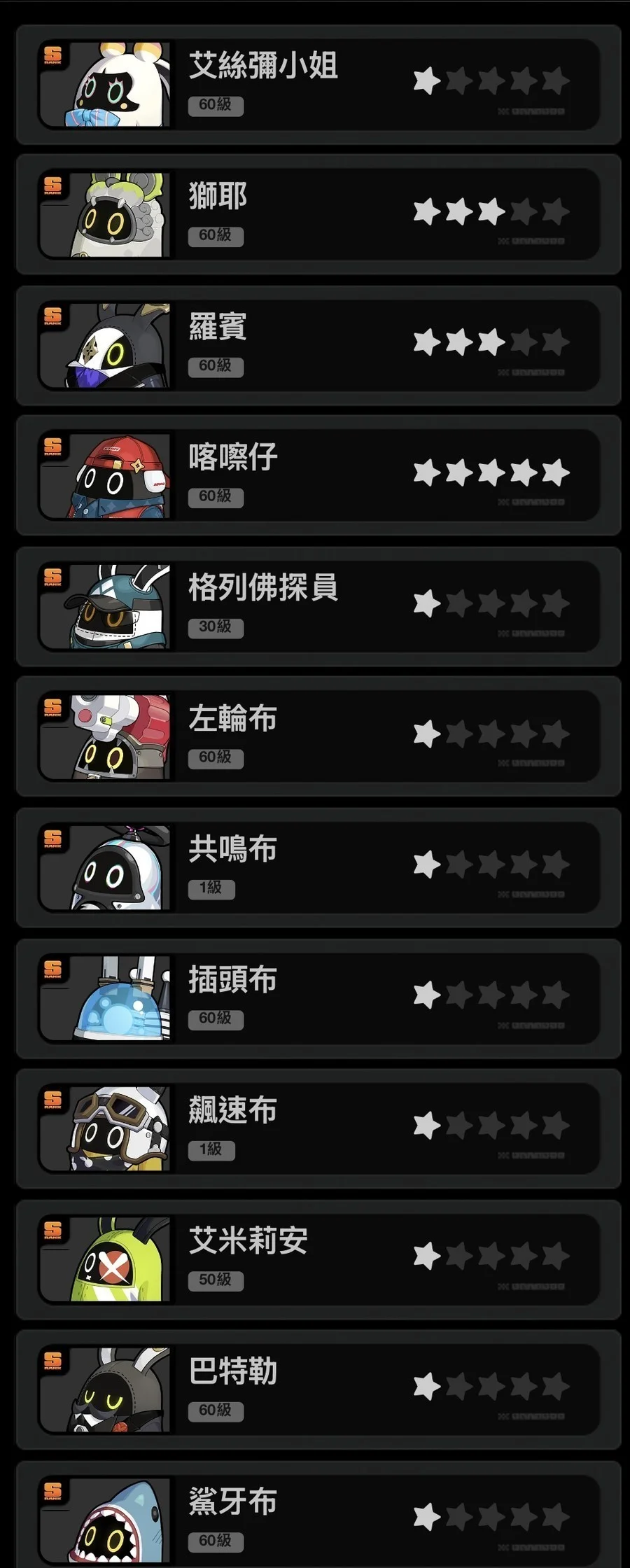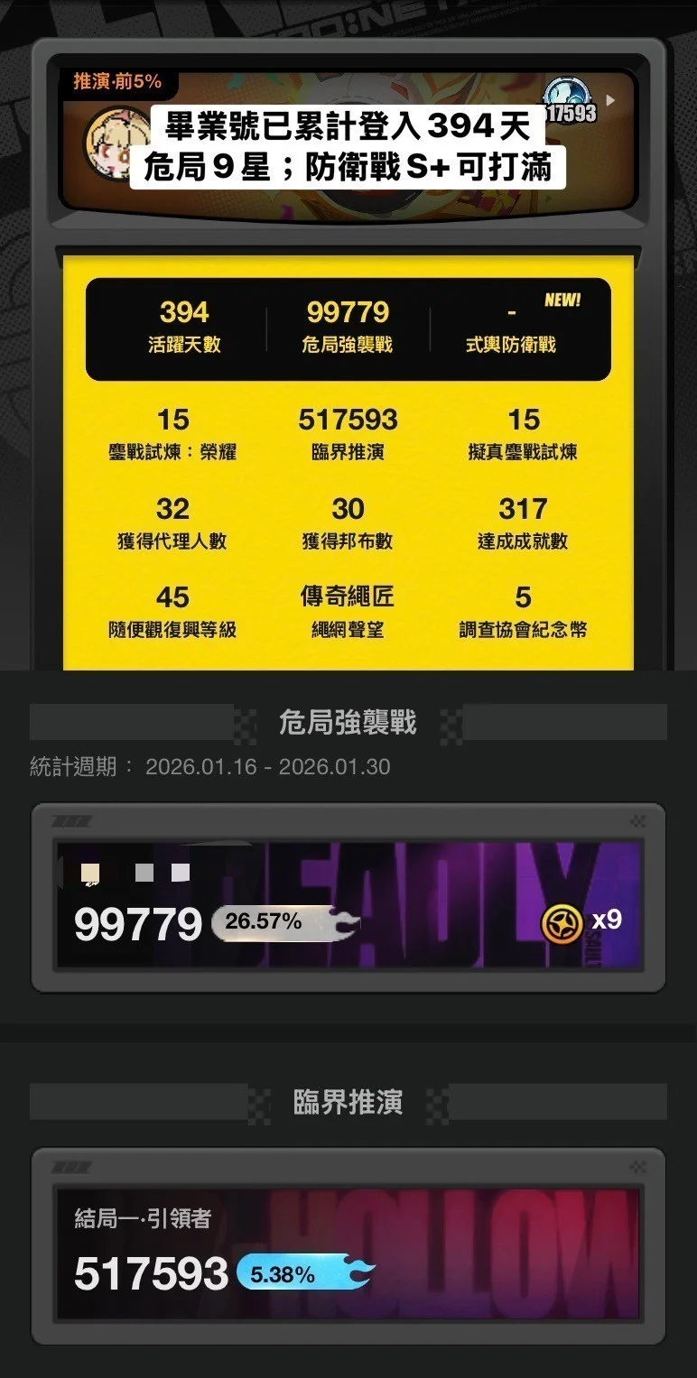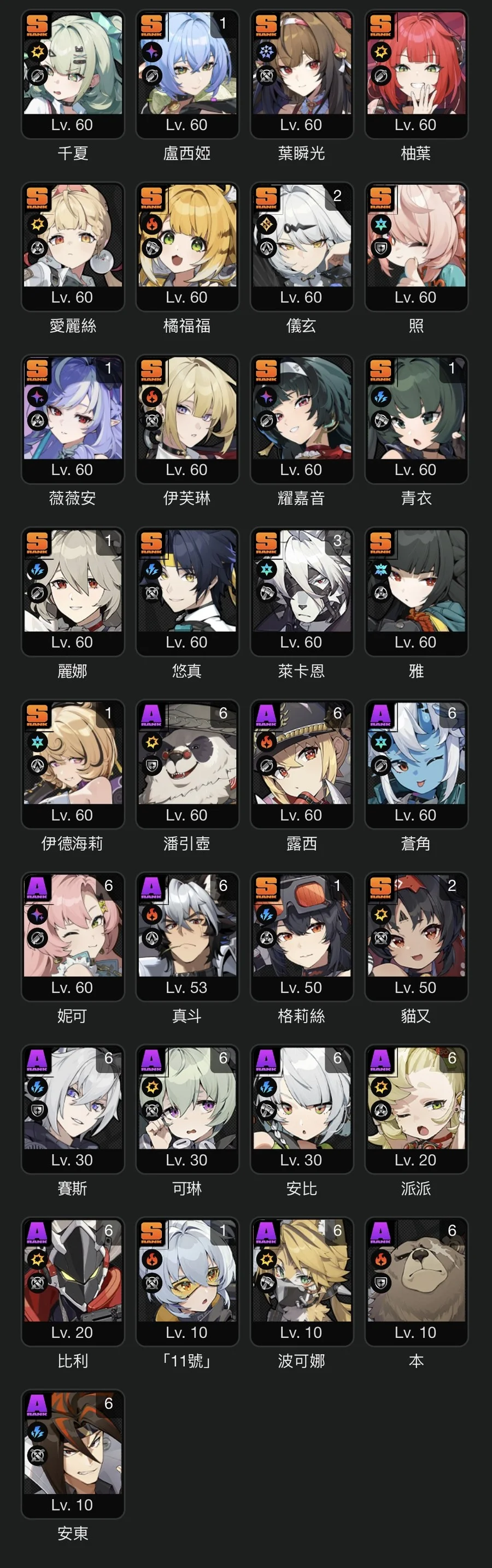 角色都有練度基本上每期危局跟防衛戰都能打滿,本期危局9星、本期防衛戰S+