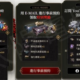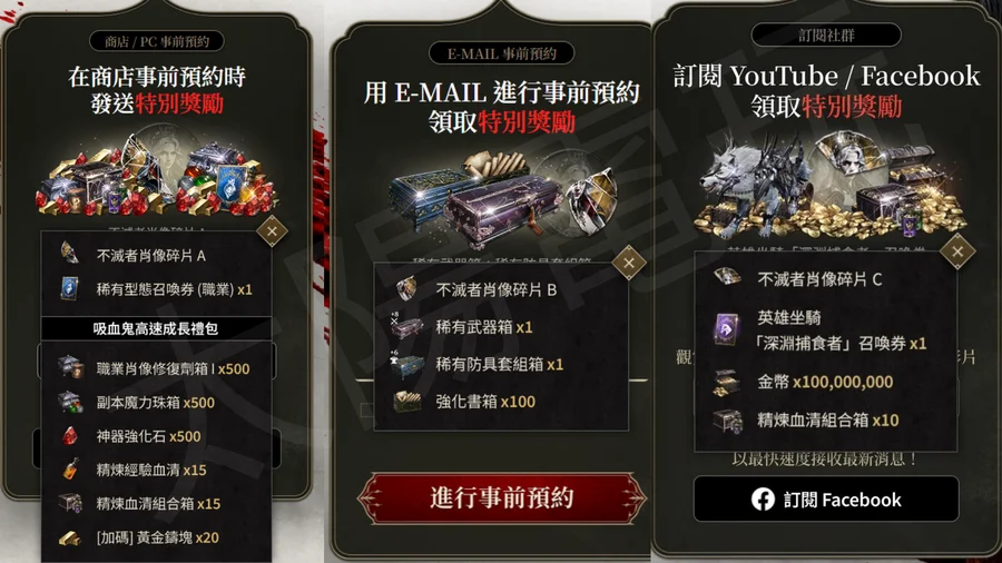 ✔一個帳號僅限「一個角色」可至遊戲內信箱領取事前預約三個獎勵一次。
