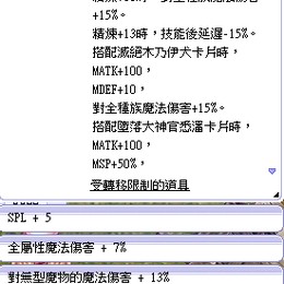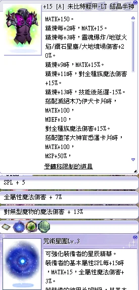 如圖+15[A階]朱比特輕甲-LT [拉斯甘德卡片]咒術星團LV3 魔力尼夫LV2六花附魔[SPL+5全屬7%無形魔法13%]+15比起+14 會讓朱比特的精練效果而外提升多增加 9%全體型魔法傷害多增加 7%靈魂連擊技能傷害最重要會多減少7秒終極念力冷卻時間玩過念咒都懂,朱比特+神吟靴+凱特音盤+持續時間=298秒會有2秒的致命空窗期,這件朱比特直接可以不切裝備滿足秒數需求可以直接下標,有任何疑問請小窗
